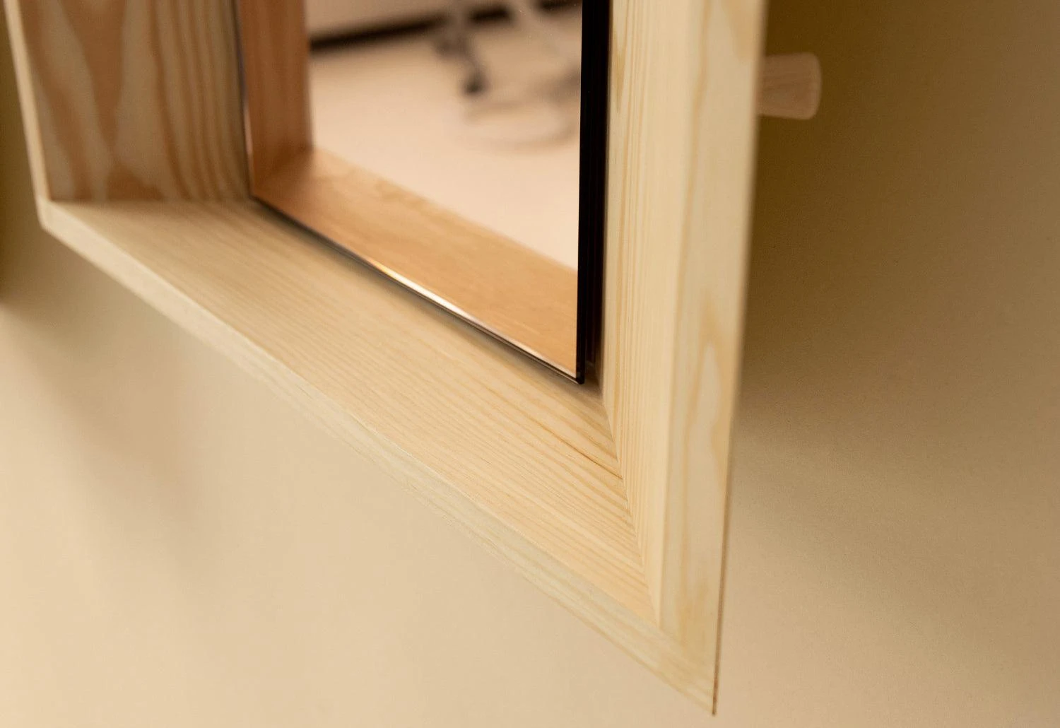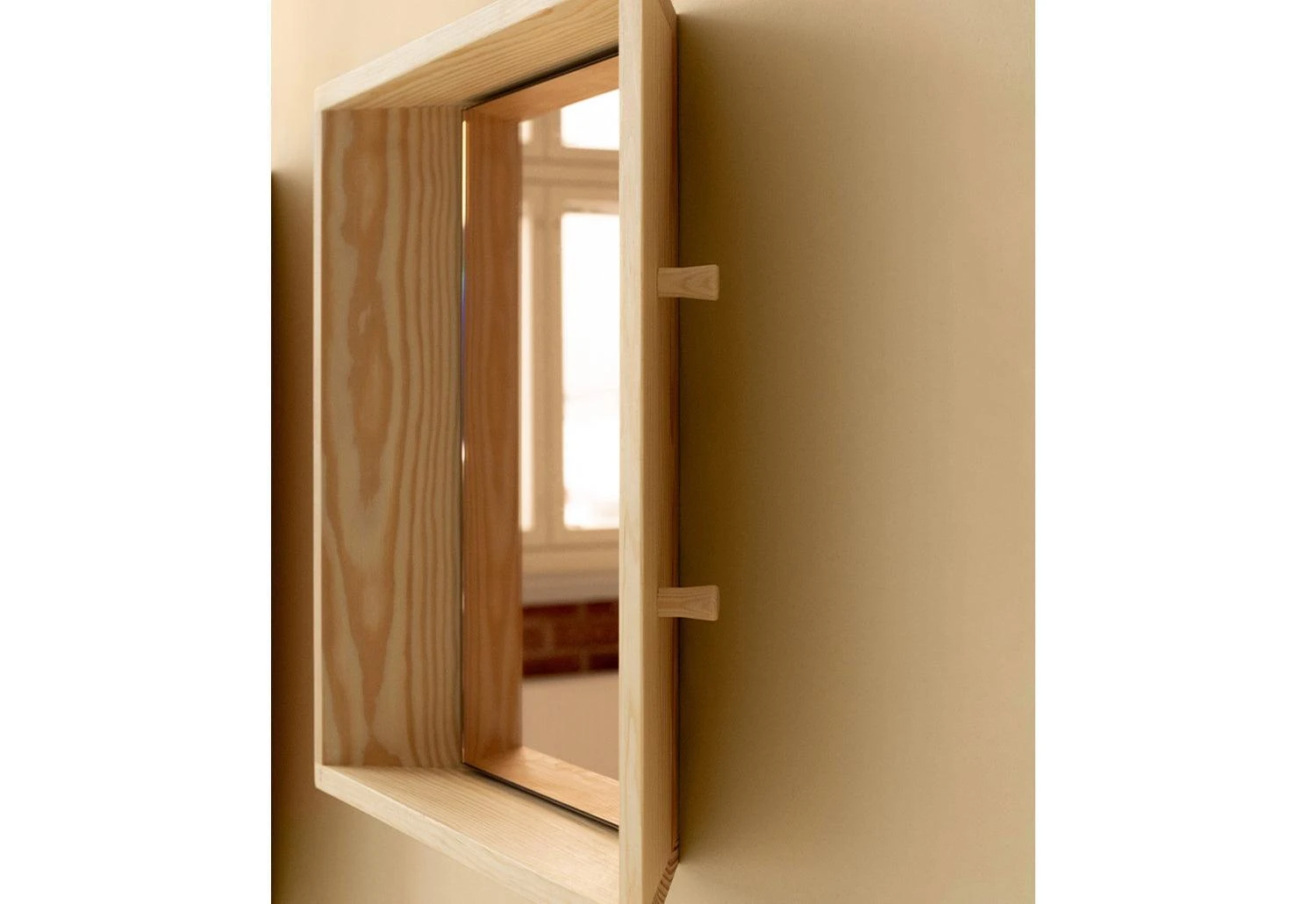 The base of the solid pine structure doubles as a shelf, and the mirror is complete with a row of discreet, functional hooks on the back of the larger angled side.