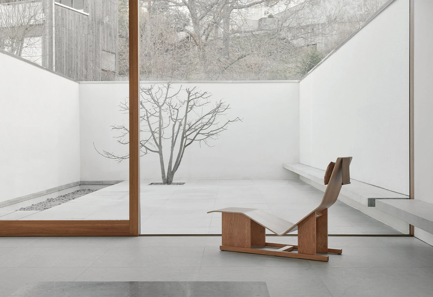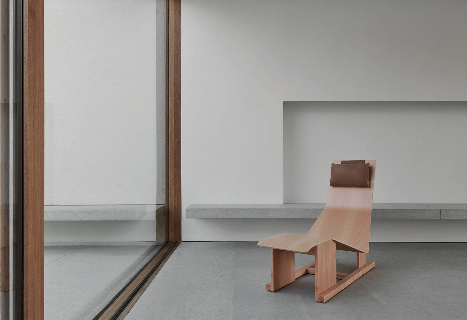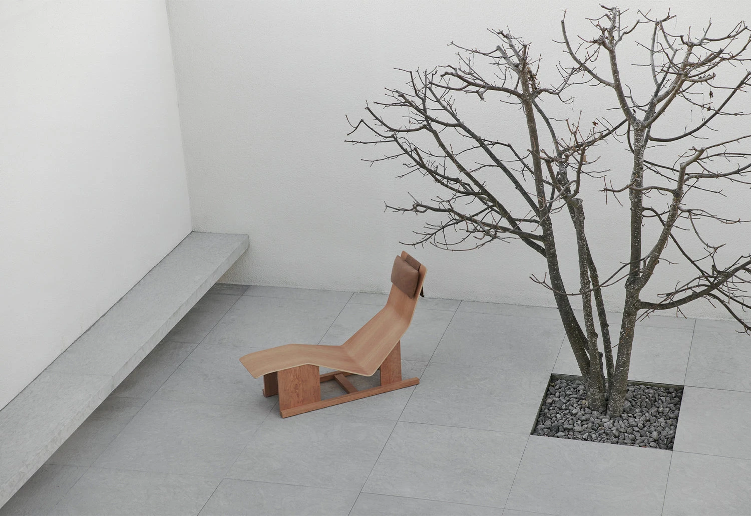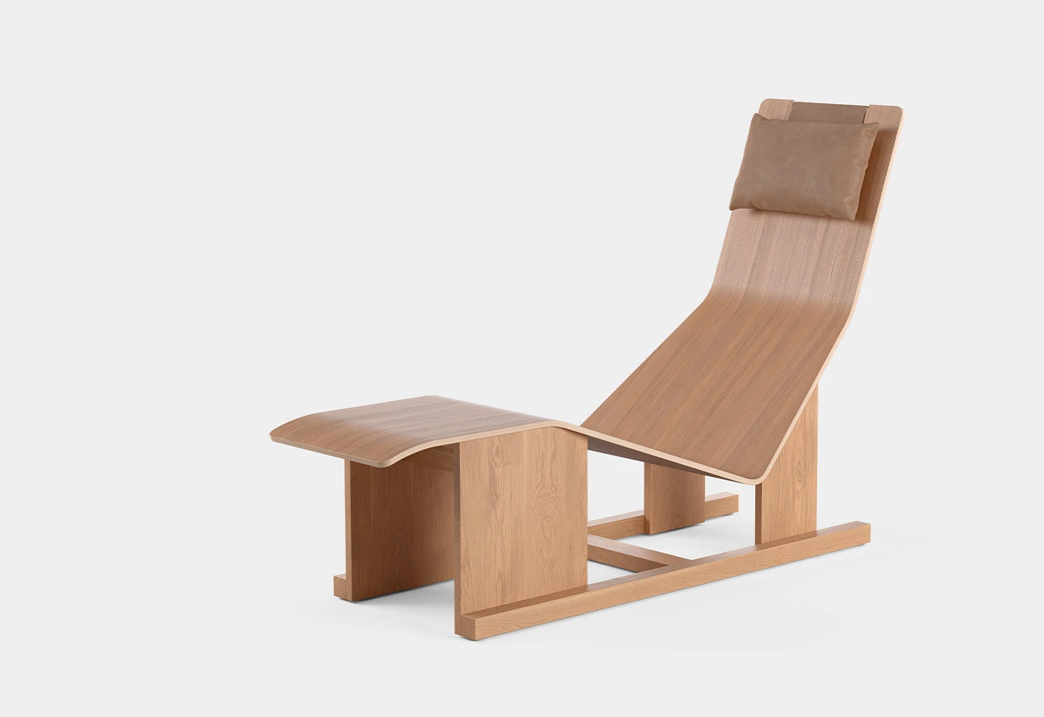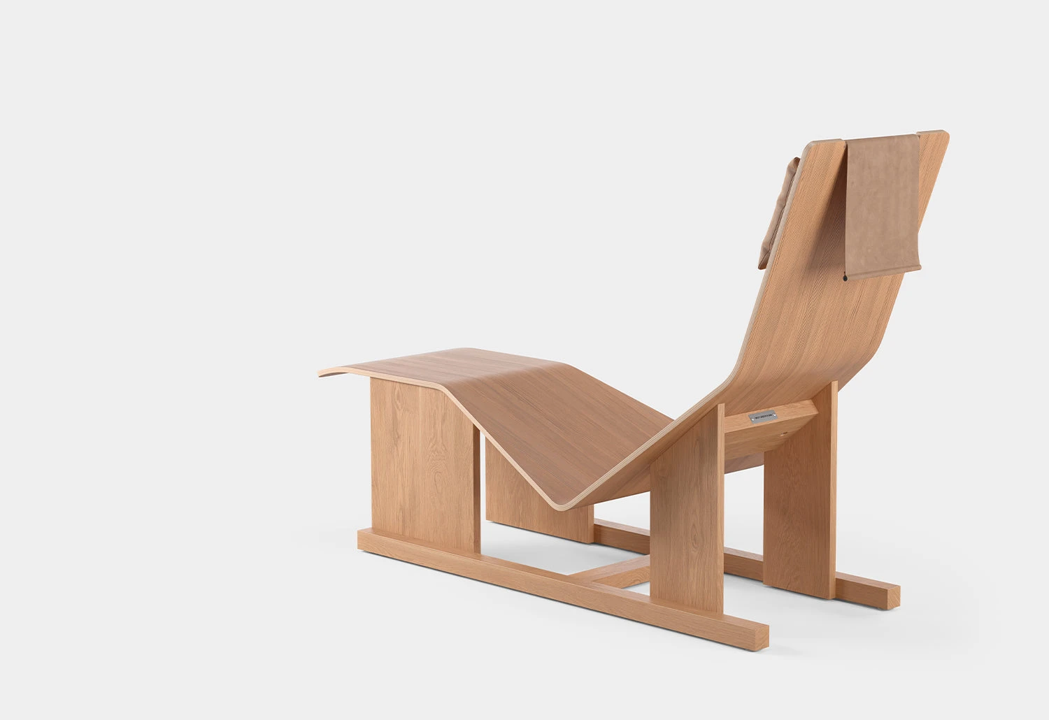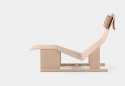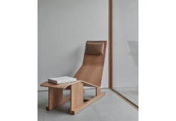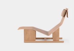 The chaise lounge has a soft leather headrest that elegantly balances on top of the backrest using an enclosed steel weight.
