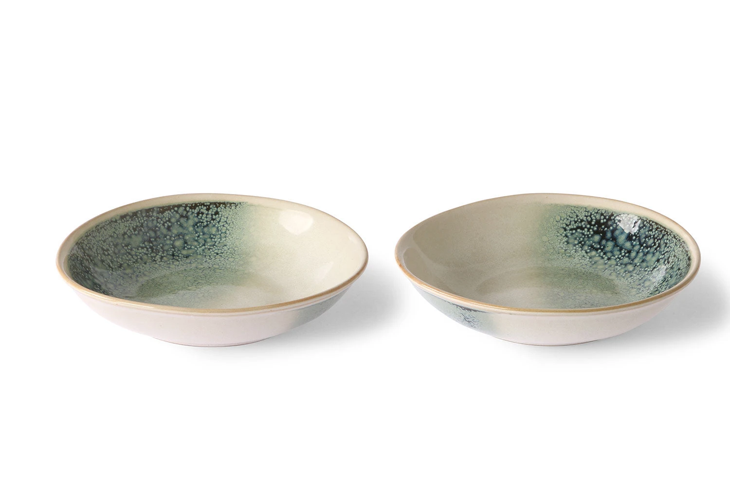 The Curry Bowls are decorated with a mottling effect and a soft vintage-inspired mist colour. Their shallow and wide forms make them ideal for serving curry, pasta and large salads.