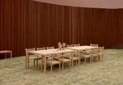 Homann’s signature design style and his penchant for gentle curves are evident in the furniture’s handsome design. The wood’s joints exhibit a simple yet considered aesthetic, with bars seamlessly blending into the wooden frame, whilst the astute design ensures the furniture is stackable, making it easy to store when not in use.