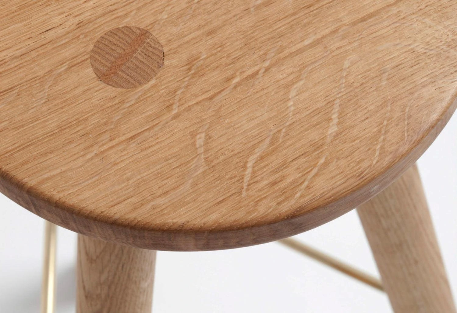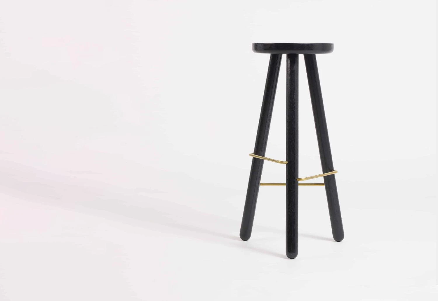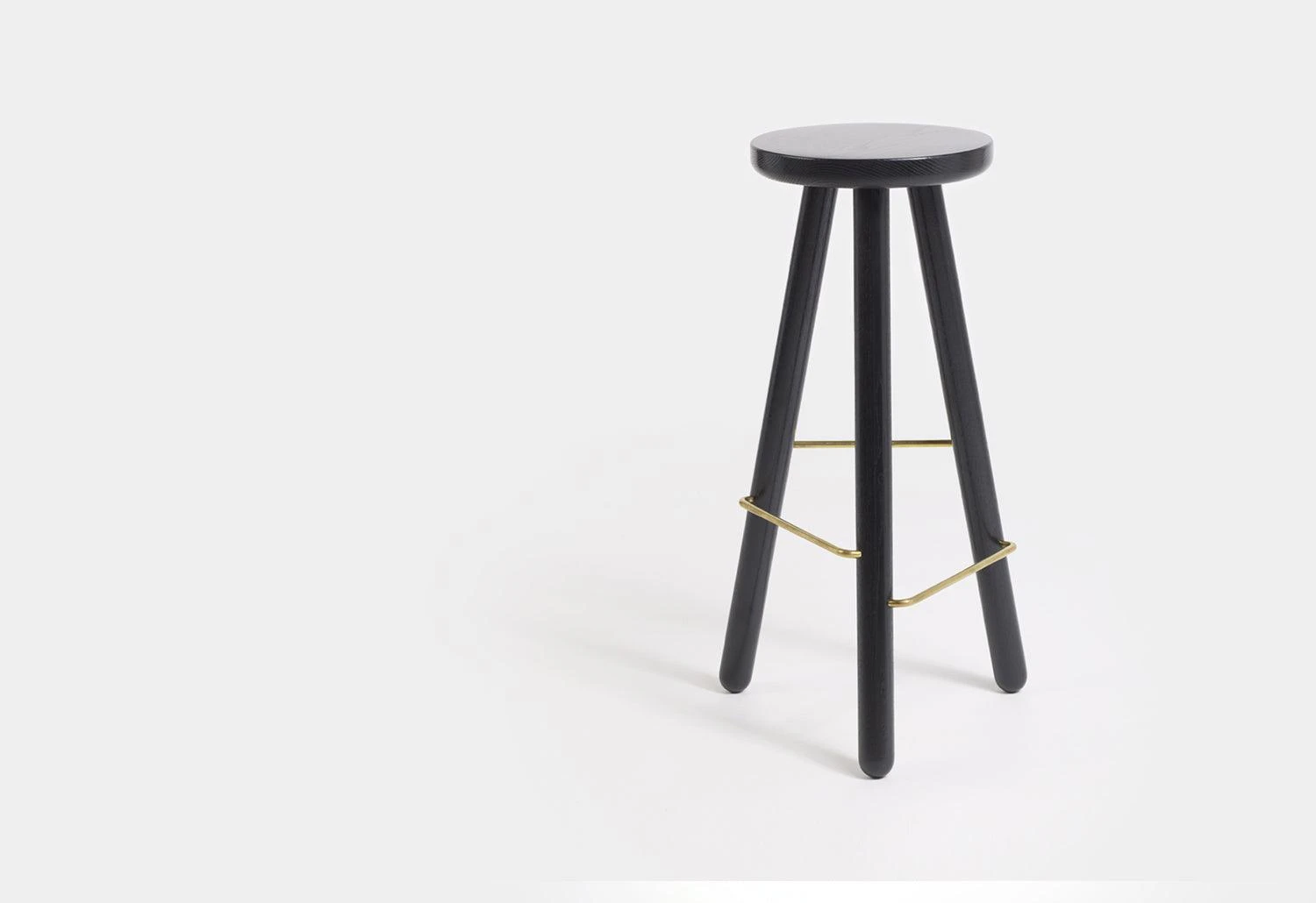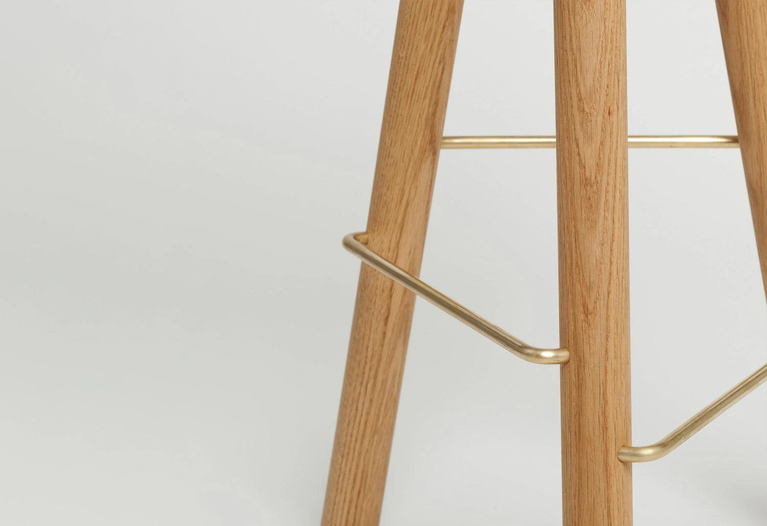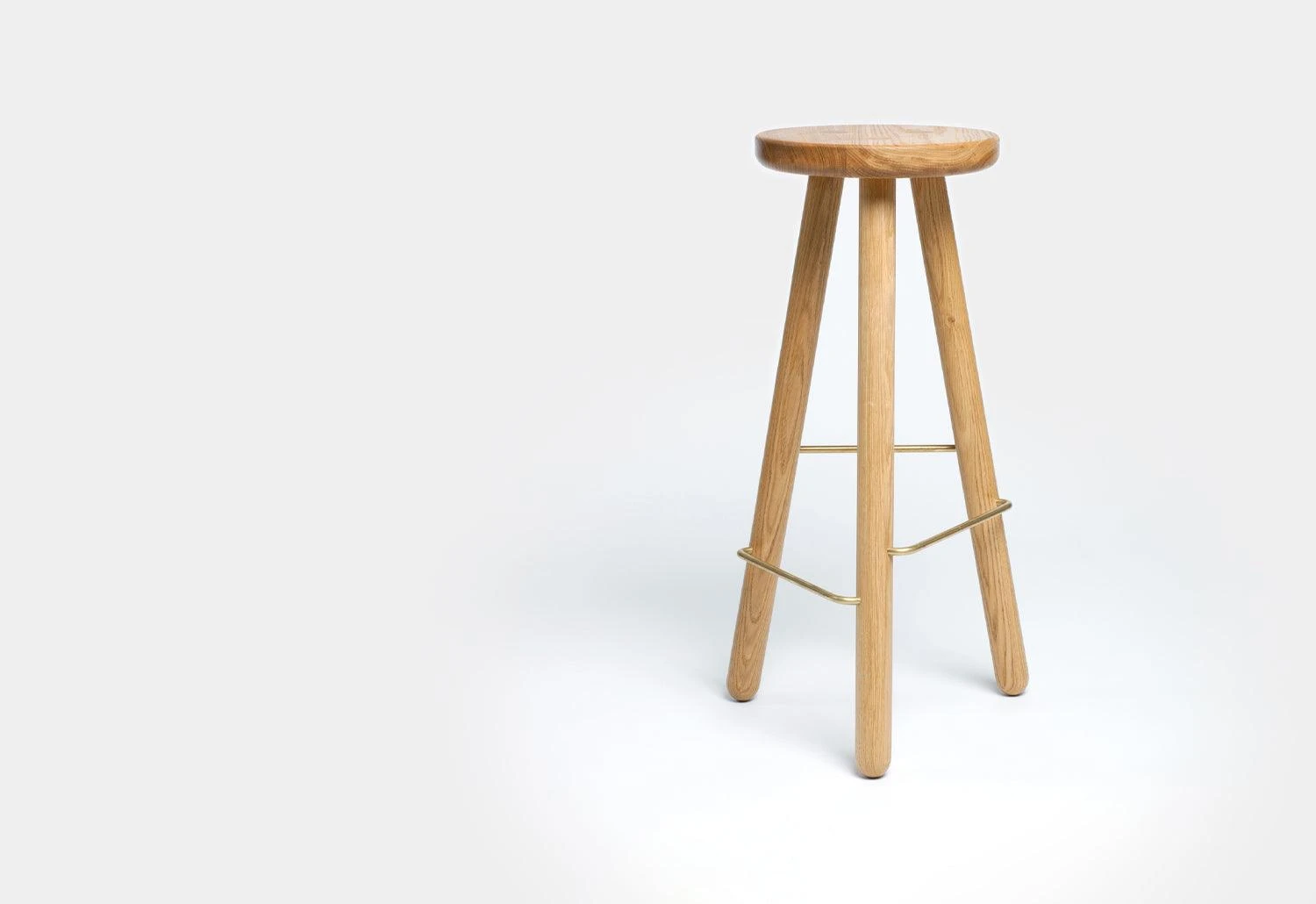 The Bar Stool One has three turned legs attached to the seat using a peg system that provides the stool with a craft-inspired detail.