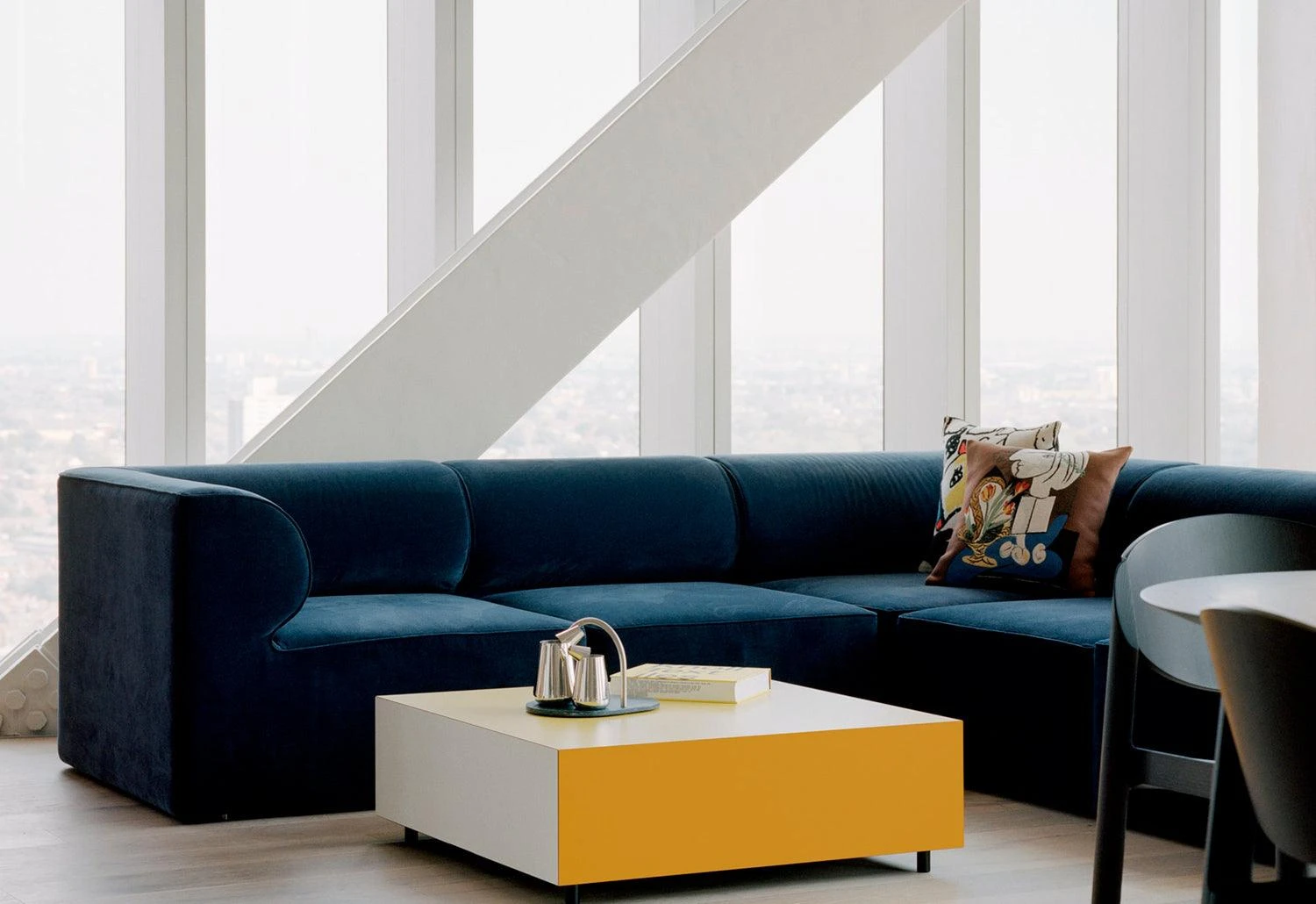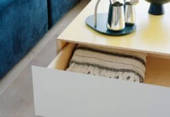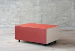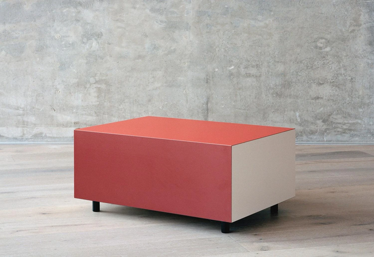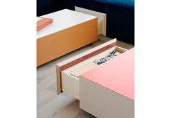The colourful Bloc side tables feature a hidden drawer in the plywood build with a soft-open mechanism. The graphic design adds a playful element to the room and is suitable for a wide range of environments.