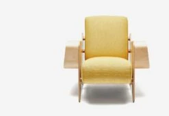 The chair’s armrest incorporates a shelf which doubles as a display case for objects or simply as a handy place to put your drink or book while seated.