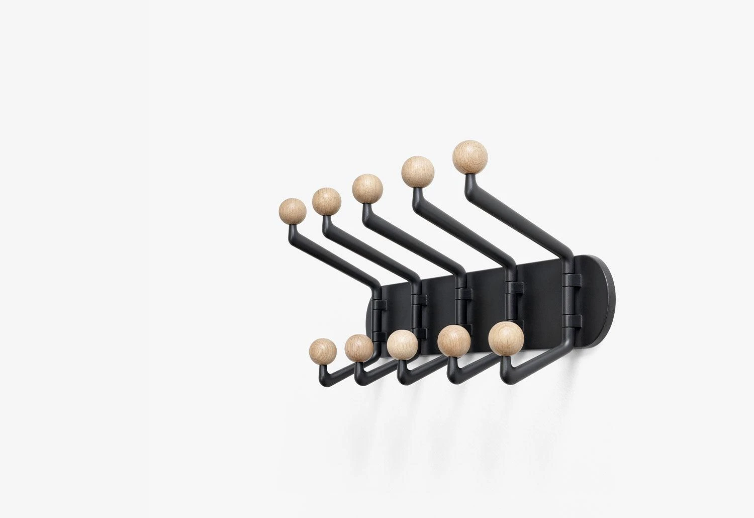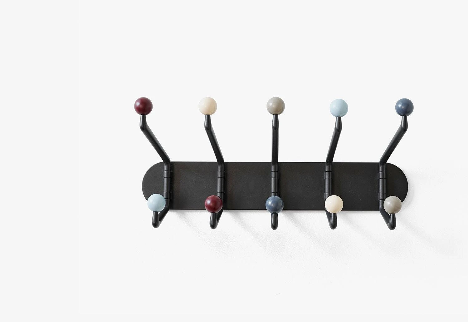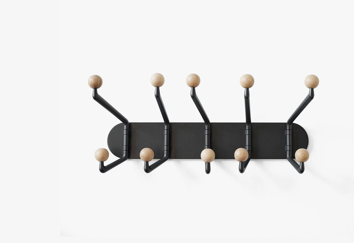 The wall hooks are available in two finishes; multi-coloured hooks for a playful aesthetic and natural oak for a classic style.