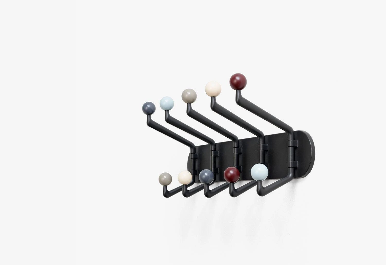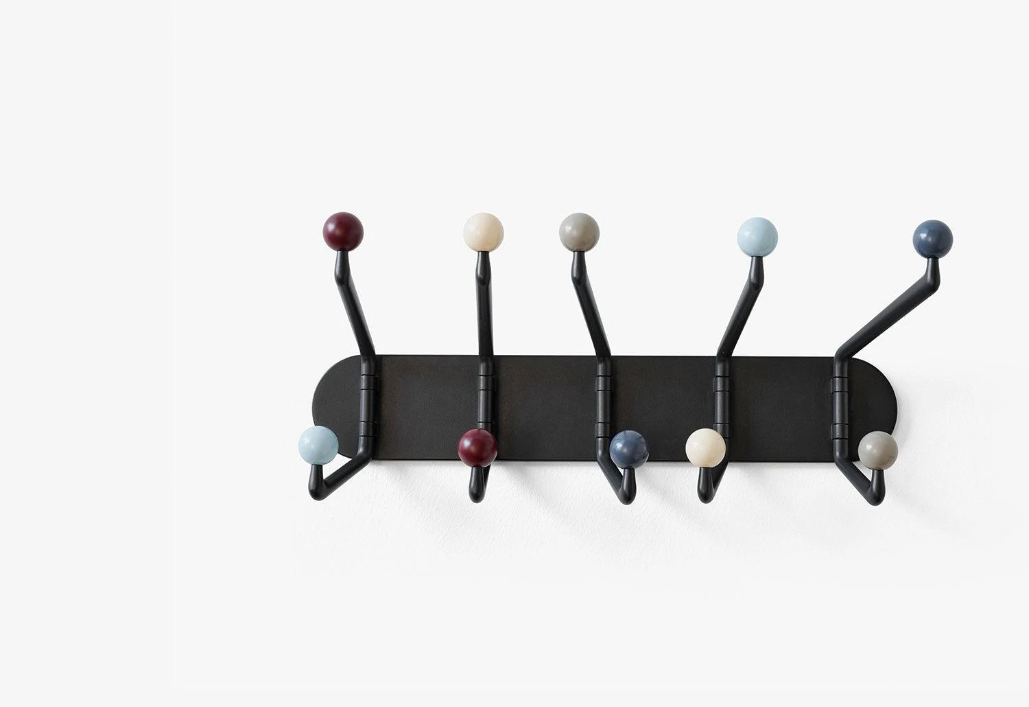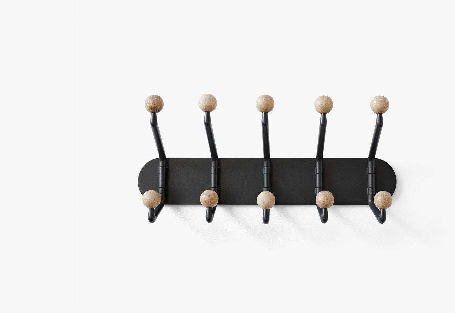 The wall hooks are available in two finishes; multi-coloured hooks for a playful aesthetic and natural oak for a classic style.