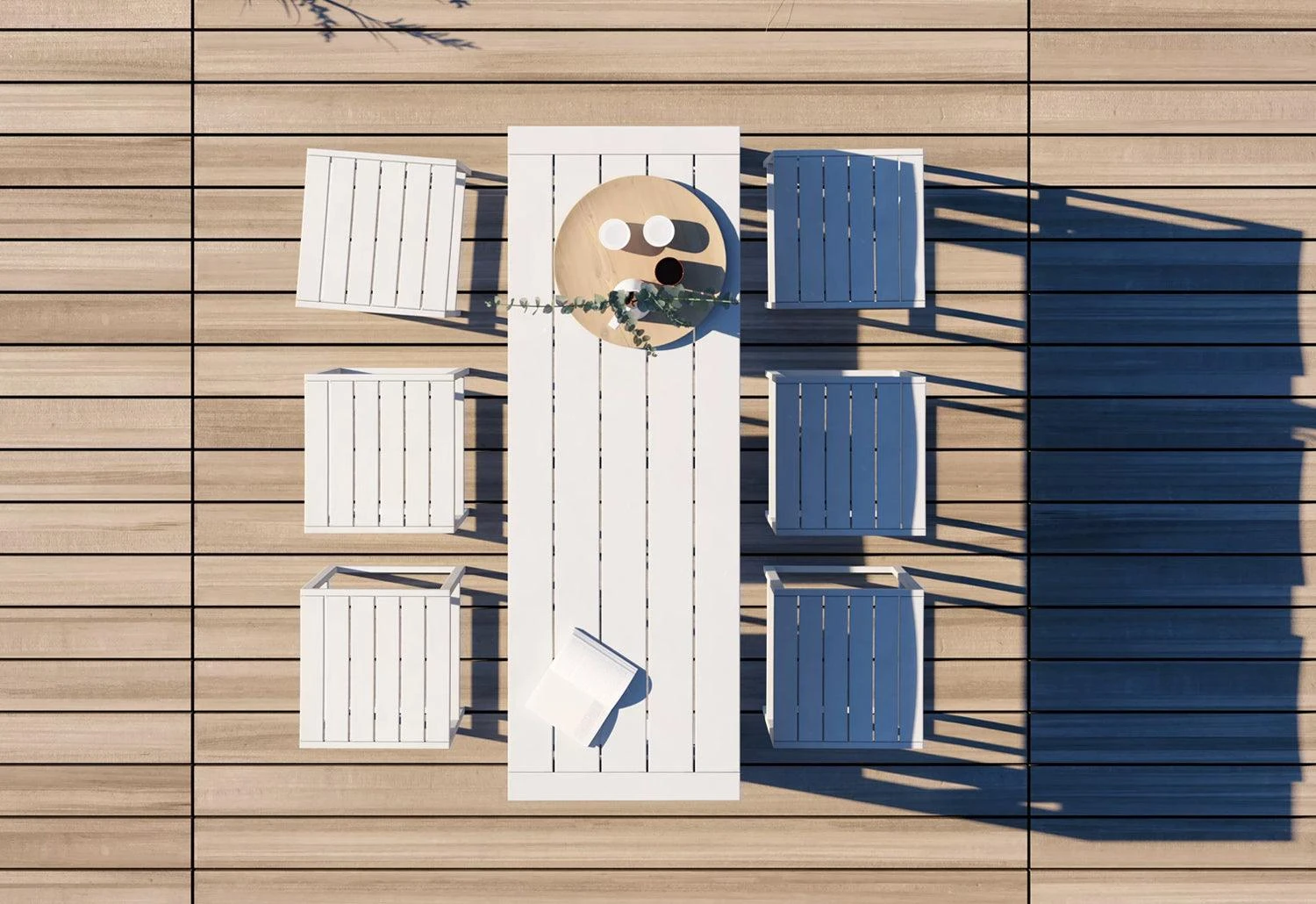 The collection named after the goddess of dawn and bearer of light in Greek mythology, Eos is a classic and well-proportioned outdoor living collection. The Eos dining series is robust yet light with durable properties suited for alfresco dining and lounging during the long summer days.