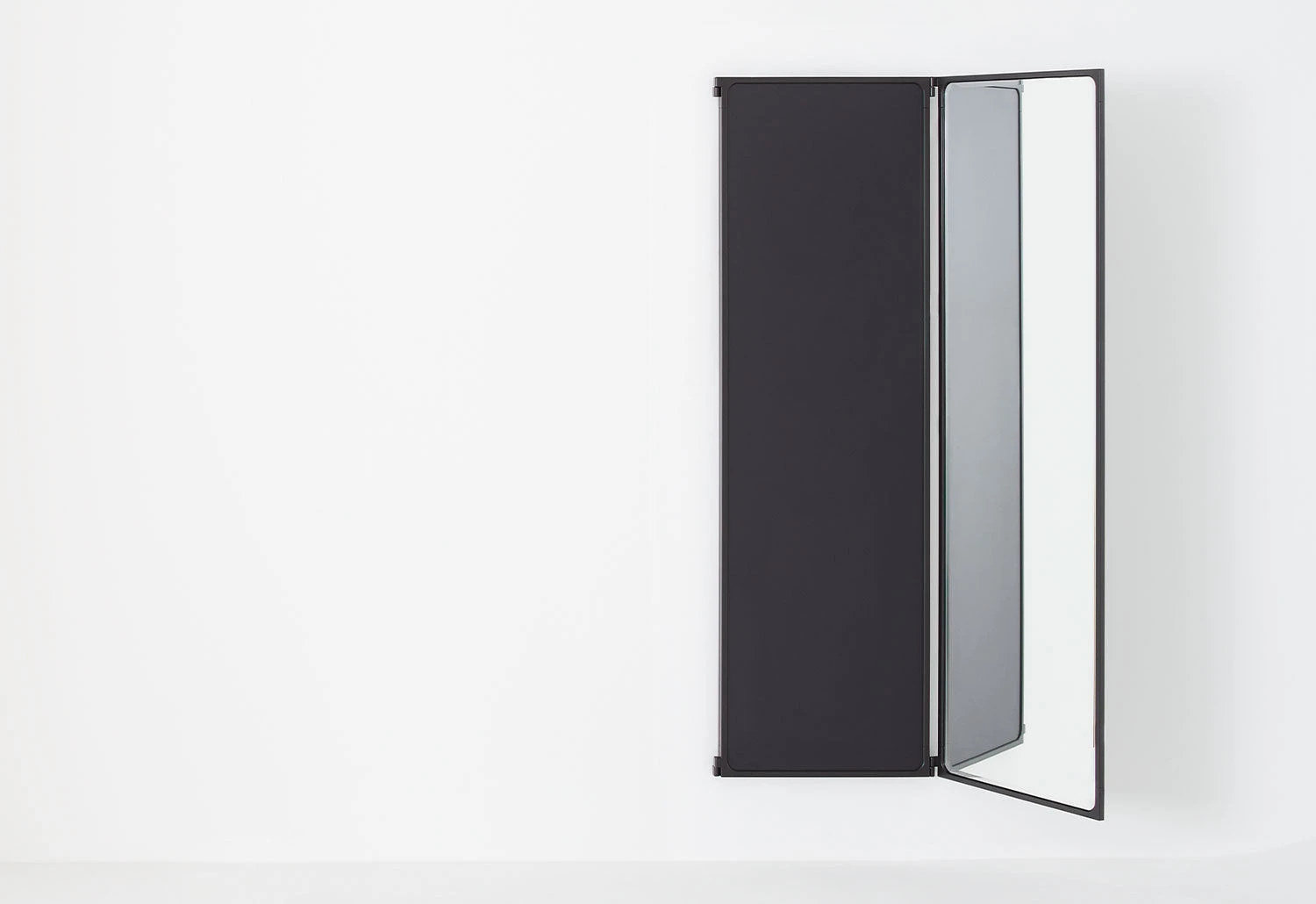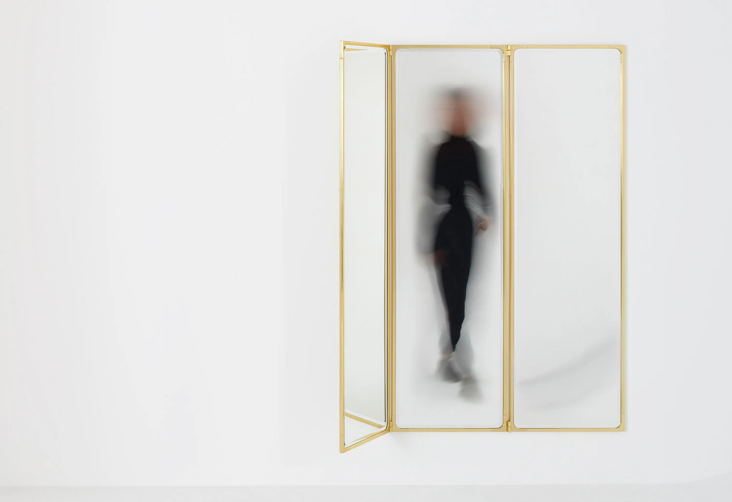 It features three panels connected via pin hinges integrated into the frames. The central panel is fixed to the wall whilst the side panels pivot, allowing them to be partially or entirely opened.