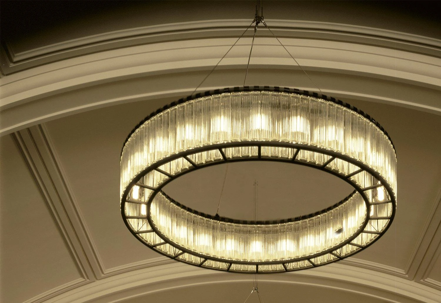 The Estadio pendant lamp is a powerful ring of light made of glass blocks that blazes and projects light. It has been installed in such distinguished settings as the Olympic Stadium and the Diocesan Museum of Vic. The metallic structure is evocative of medieval iron lights, whilst its atmospheric projection of light is wholly timeless.