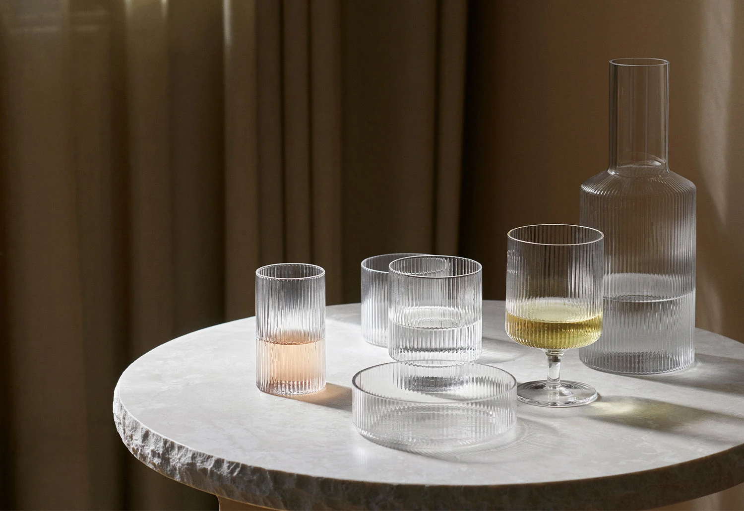 Introducing the elegant Ripple Serving Bowls from Ferm Living, crafted from exquisite glass and hand-blown into unique rippled moulds. This set of four bowls boasts the same distinct surface pattern found in the Ripple series.