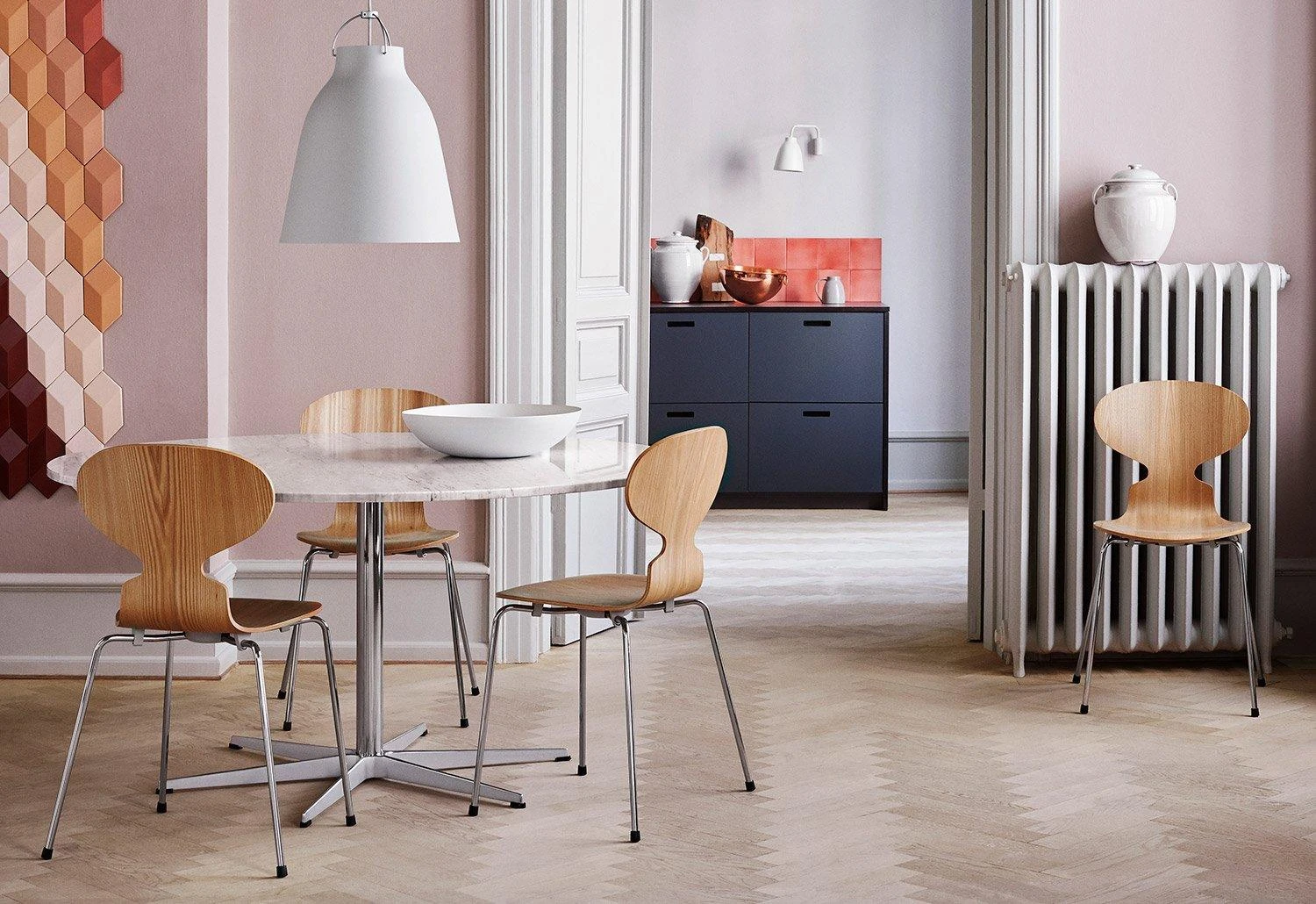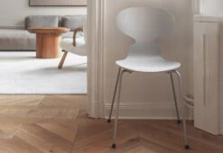 The classic Ant chair was originally designed by Arne Jacobsen in 1952 for the canteen at Novo Nordisk, a Danish healthcare company. The name of this design stems from the outline of the Ant chair, which resembles an ant with its head raised.