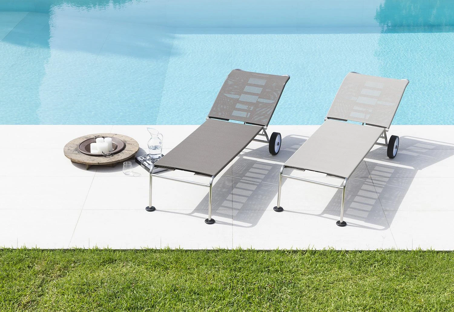 Outdoor sun lounger with a structure in brushed stainless steel and seat and white nylon wheels with black polyurethane edge.