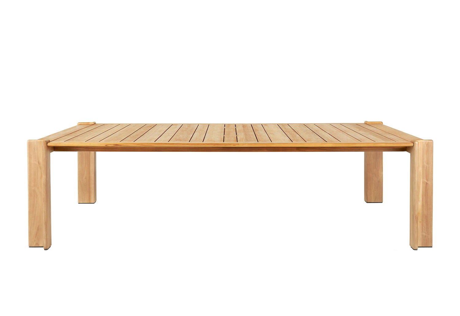 The Atmosfera Outdoor Dining tables boast a subtle, timeless beauty with minimalist slats crafted from solid, premium teak. The frame and table legs feature an inverted ‘L-shape’ miter joint, providing stability and a captivating aesthetic, enhanced by a rounded detail above the tabletop. This subtle contrast perfectly balances geometric lines and calm composure.