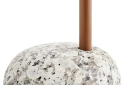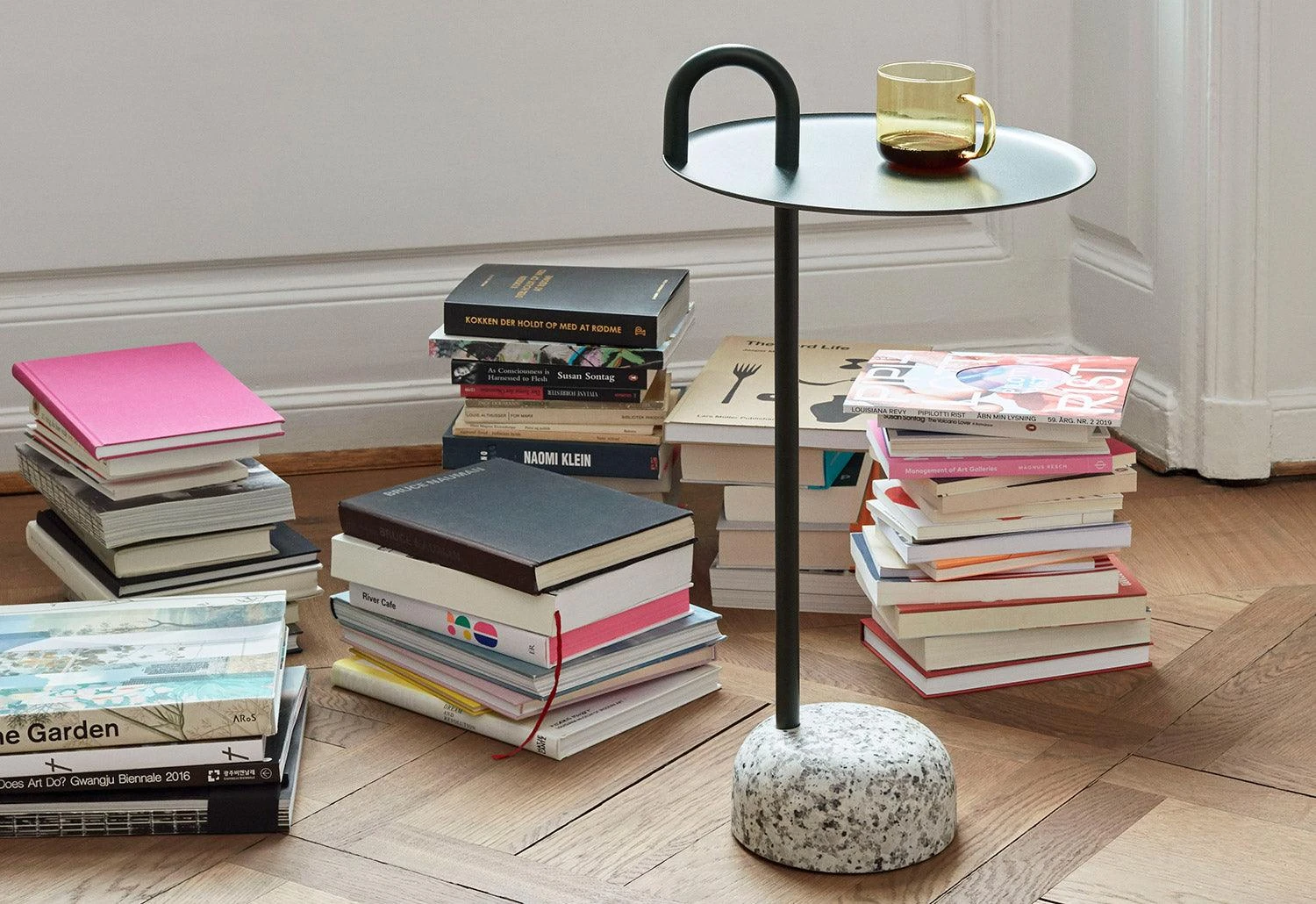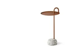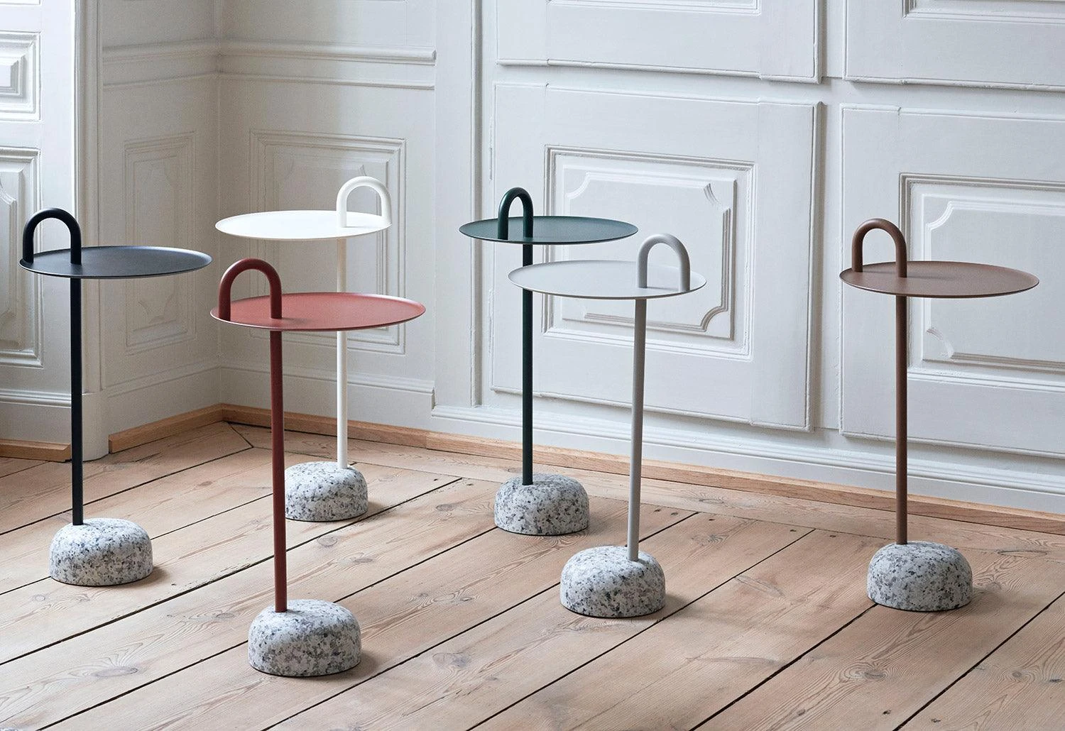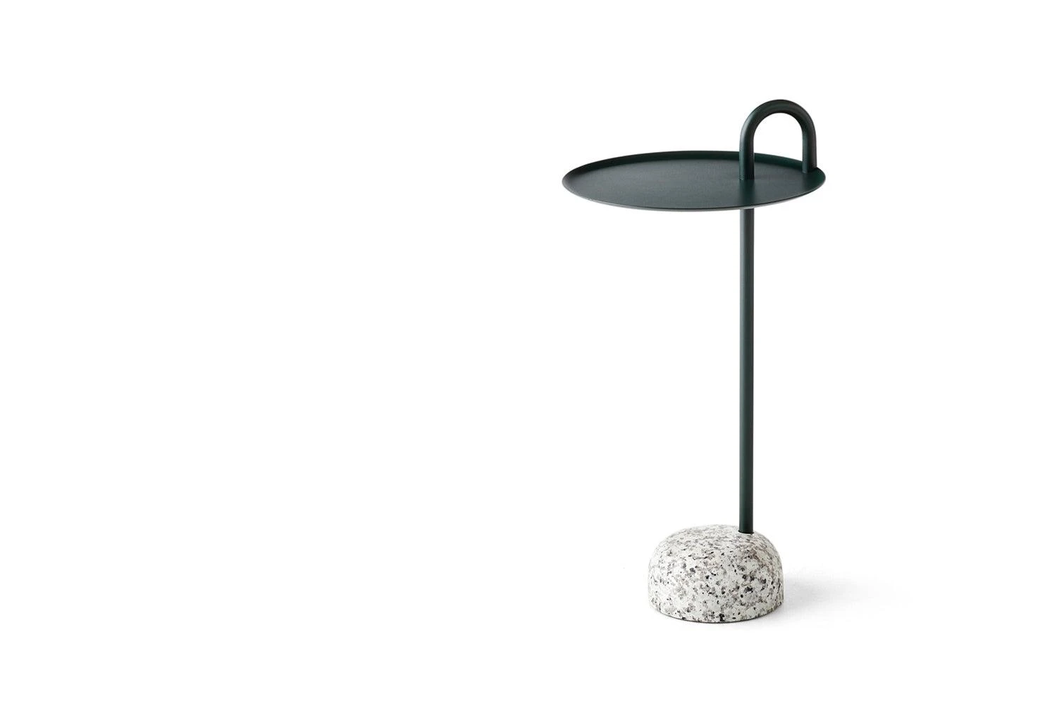 Shane Schneck’s Bowler table is a compact side table, ideal for small spaces. The Bowler has a distinctive aesthetic, its name reflected in its hat-shaped granite base. The table combines a lipped tray with steel tube stem that extends and curves above the tray, doubling as a functional handle.
