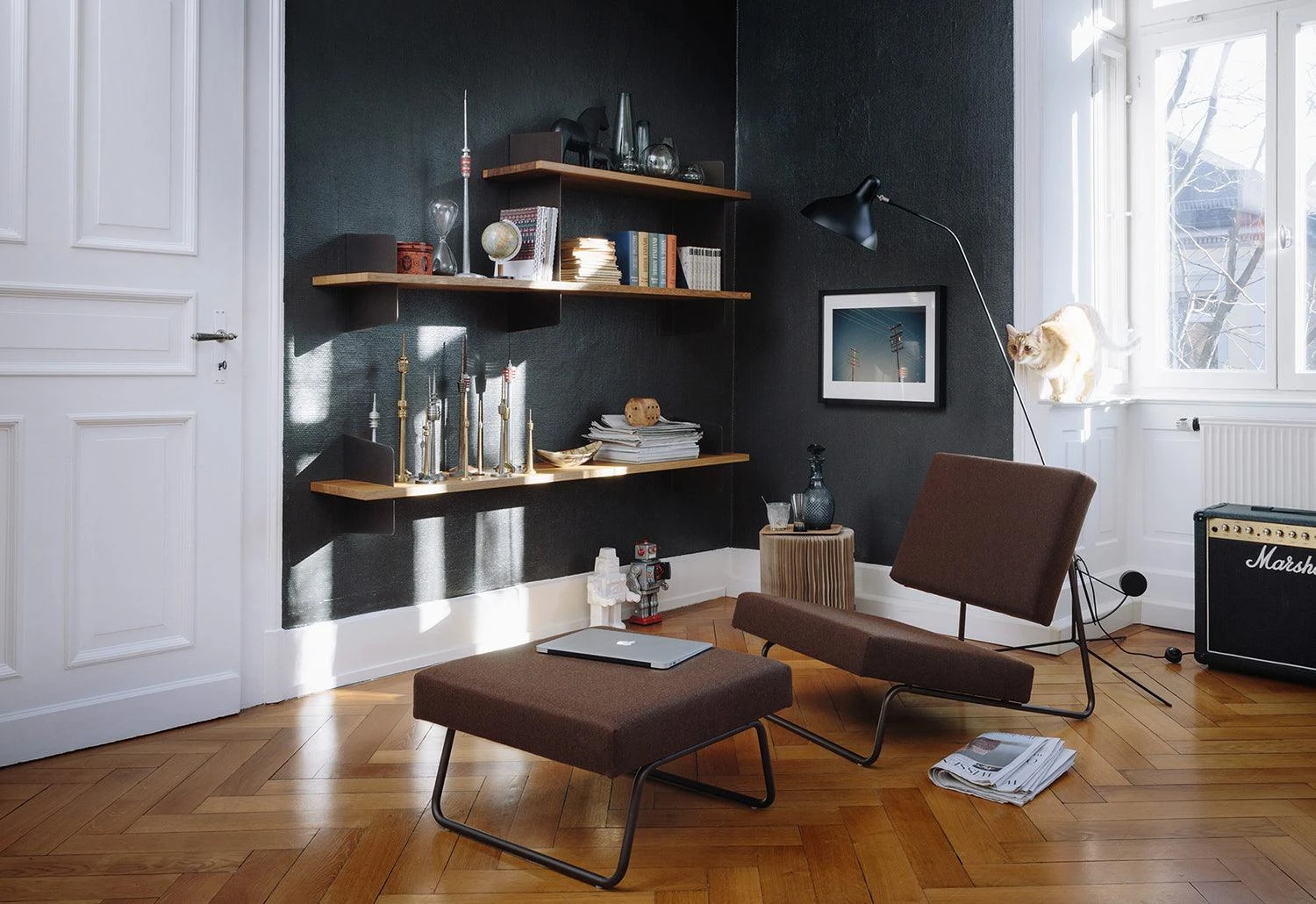 First designed for his home, the Hirche lounge chair is inspired by the Bauhaus where Herbert Hirche studied under Mies van der Rohe from 1930 to 1933. In 2000, the Herbert lounge chair was produced featuring various upholstery fabrics, leather and cowhide.