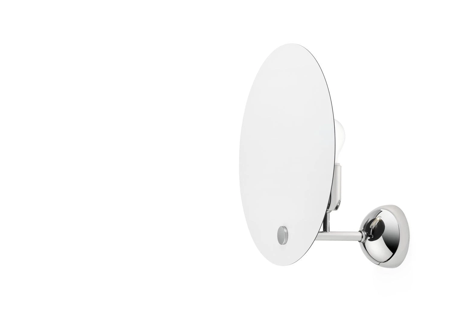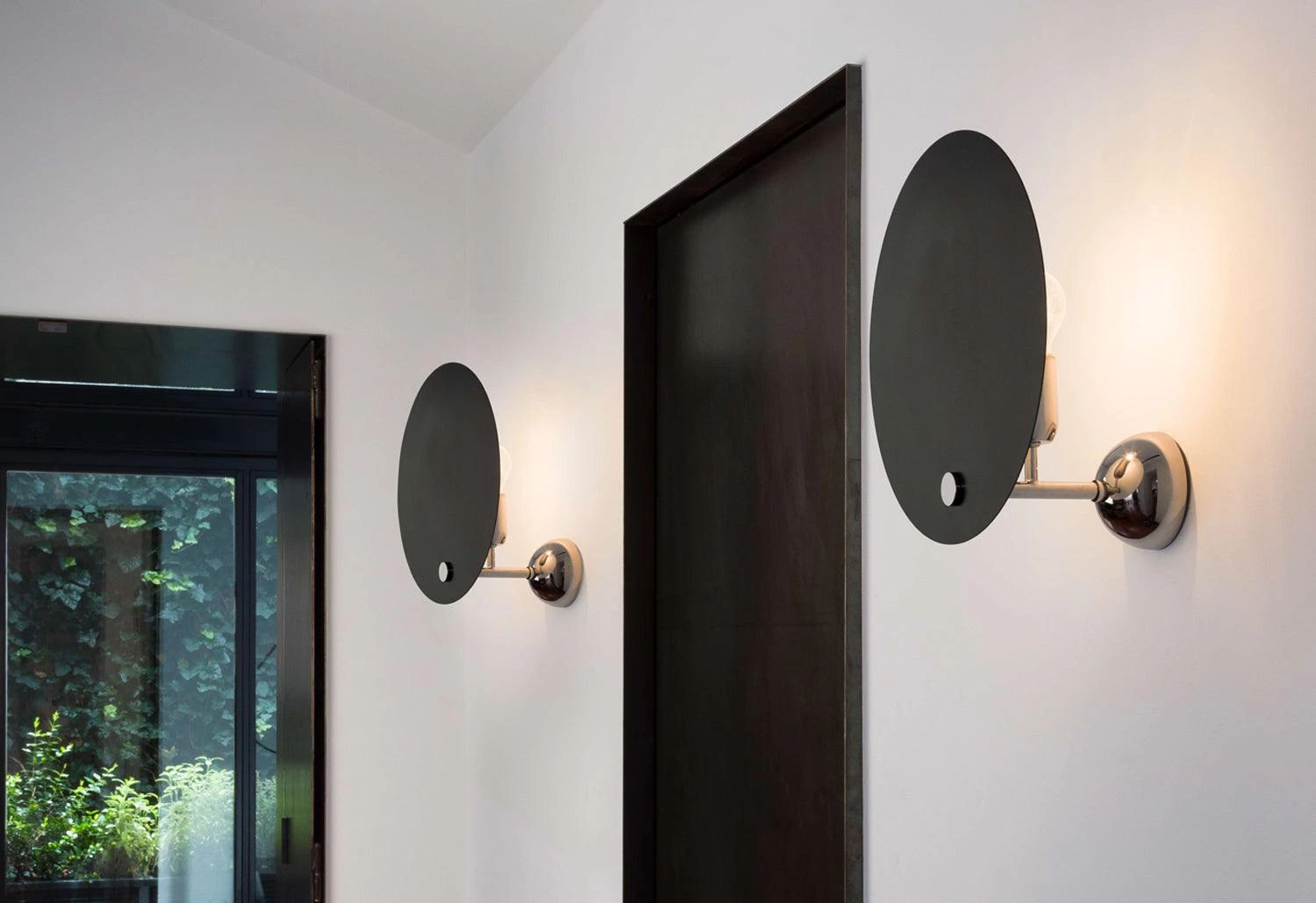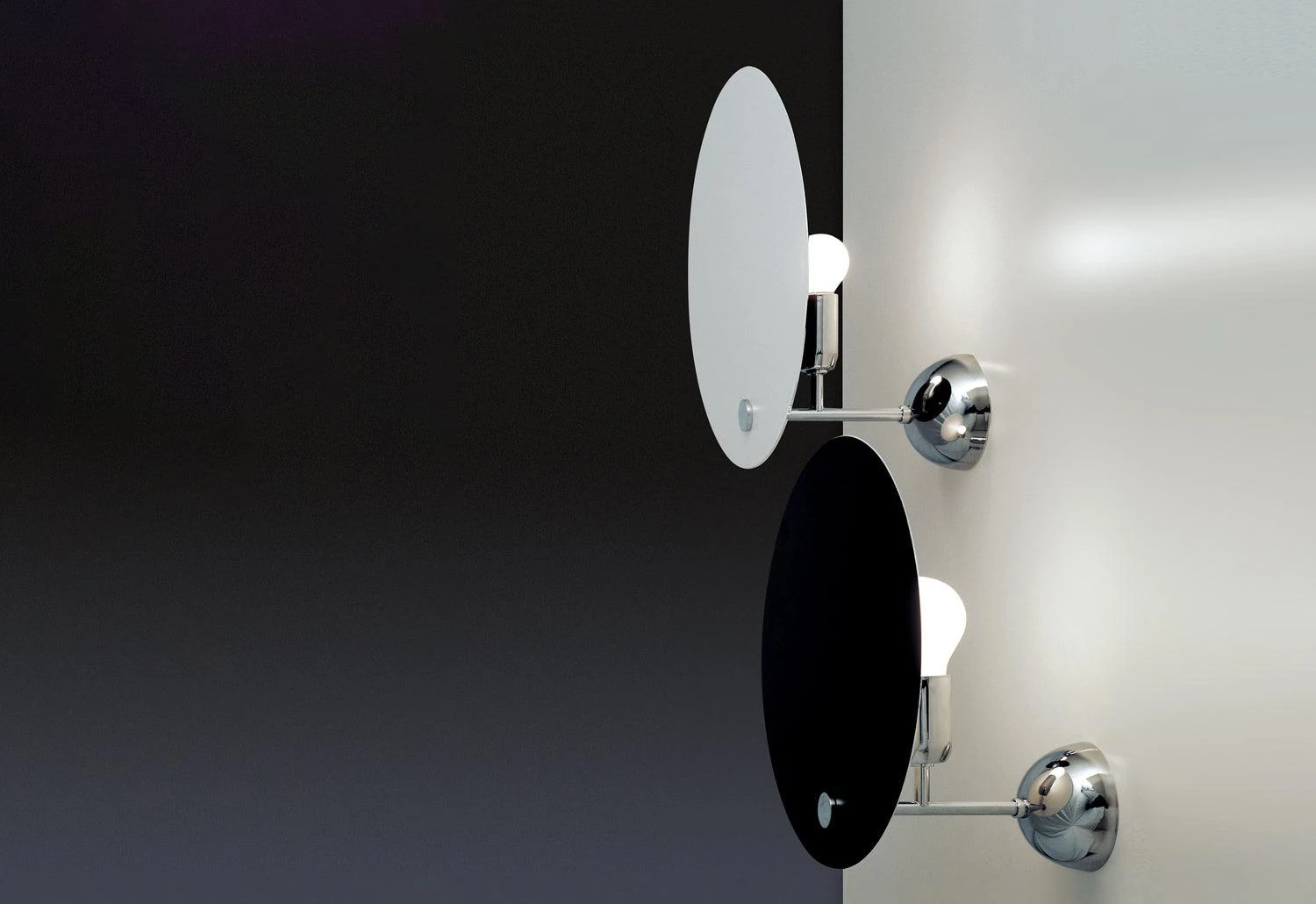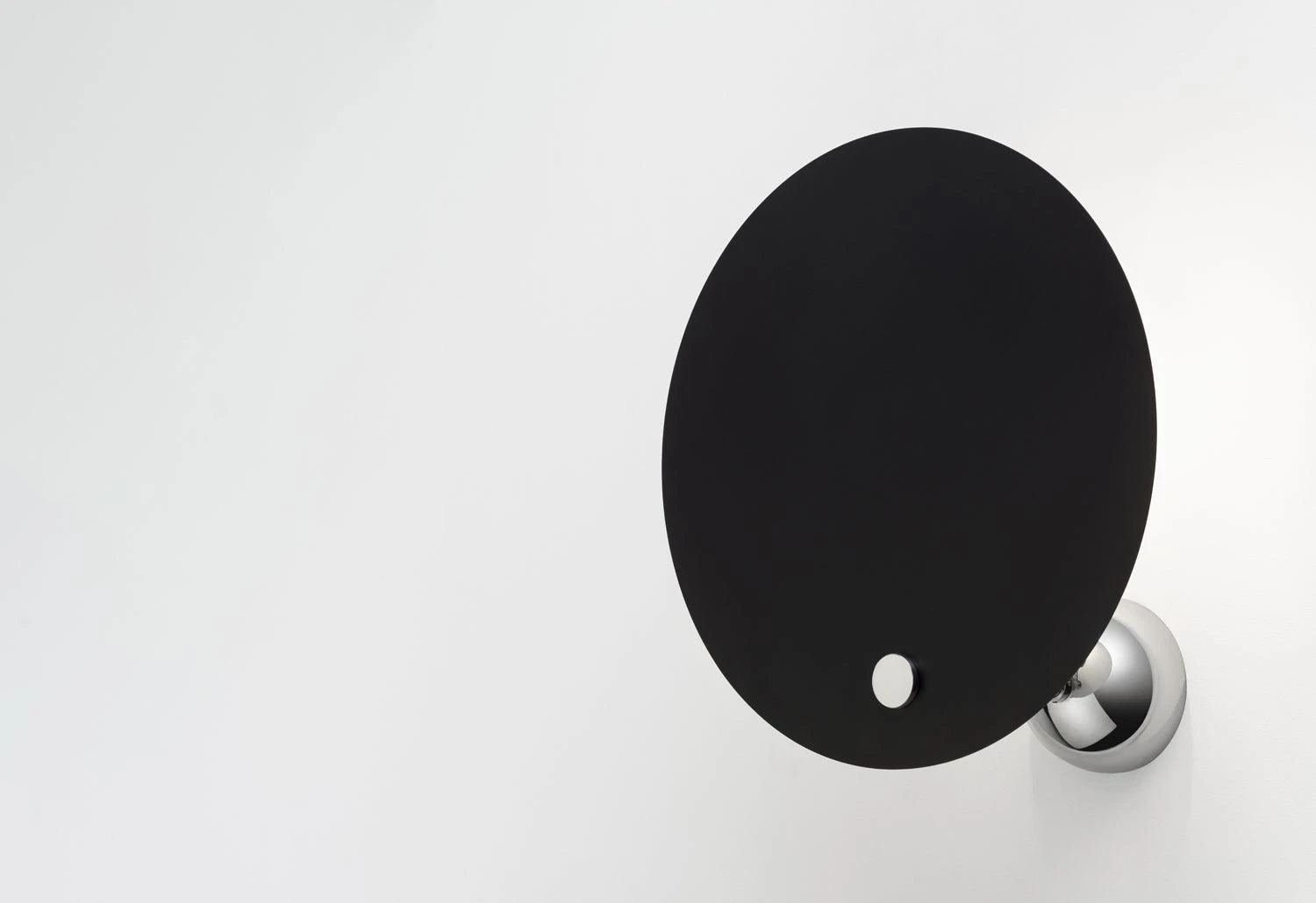 The wall lamp has a dynamic sculptural form, designed to create a unique light. The circular shade over the bulb evokes the crescent light of a solar eclipse. Available in black and white it is timeless modern light.