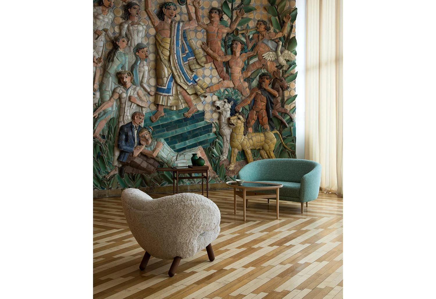 Its history is tied up in a story of romance and art; Finn Juhl’s master joiner Niels Vodder gave the compact sofa to his daughter, the wife of Frank Jæger. Jæger was a poet and used the sofa as a place of work, theorising and philosophising the world on it. The couple were friends with the illustrator Jørgen Mogensen, who would later base a comic on their home and lives. Published in the Politiken, “The Poet and the Little Mother” became an icon of Danish folk culture, from 1950 to 2003.