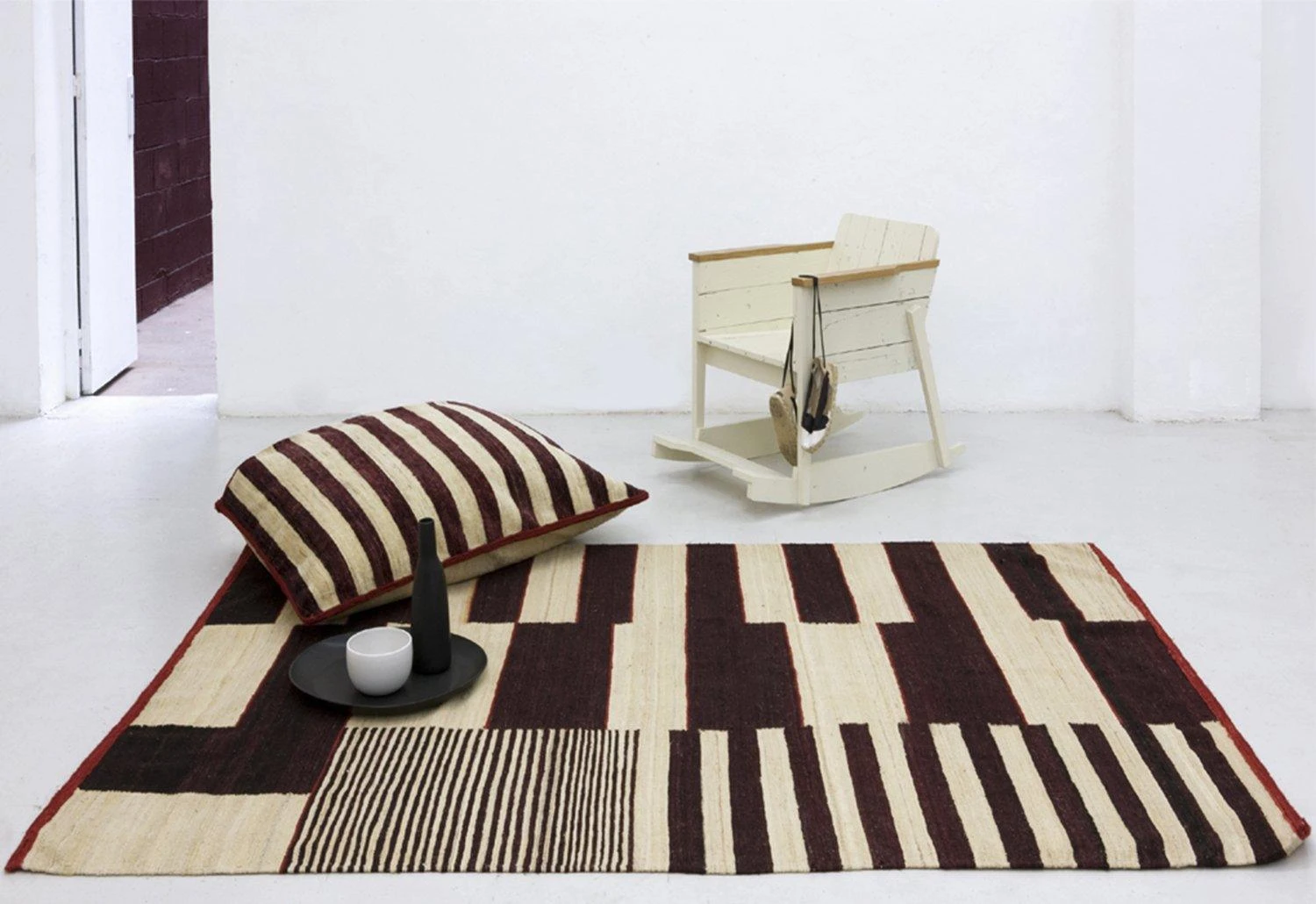 Inspired by old fashioned rugs, this collection, carried out using the kilim technique, recovers the essence of the rug, both in its texture and in its use. For the desert nomads, a house is built on a rug, as rugs originally served to protect people from the ground. They represented an object of daily use; as well as providing comfort, they also defined the space.