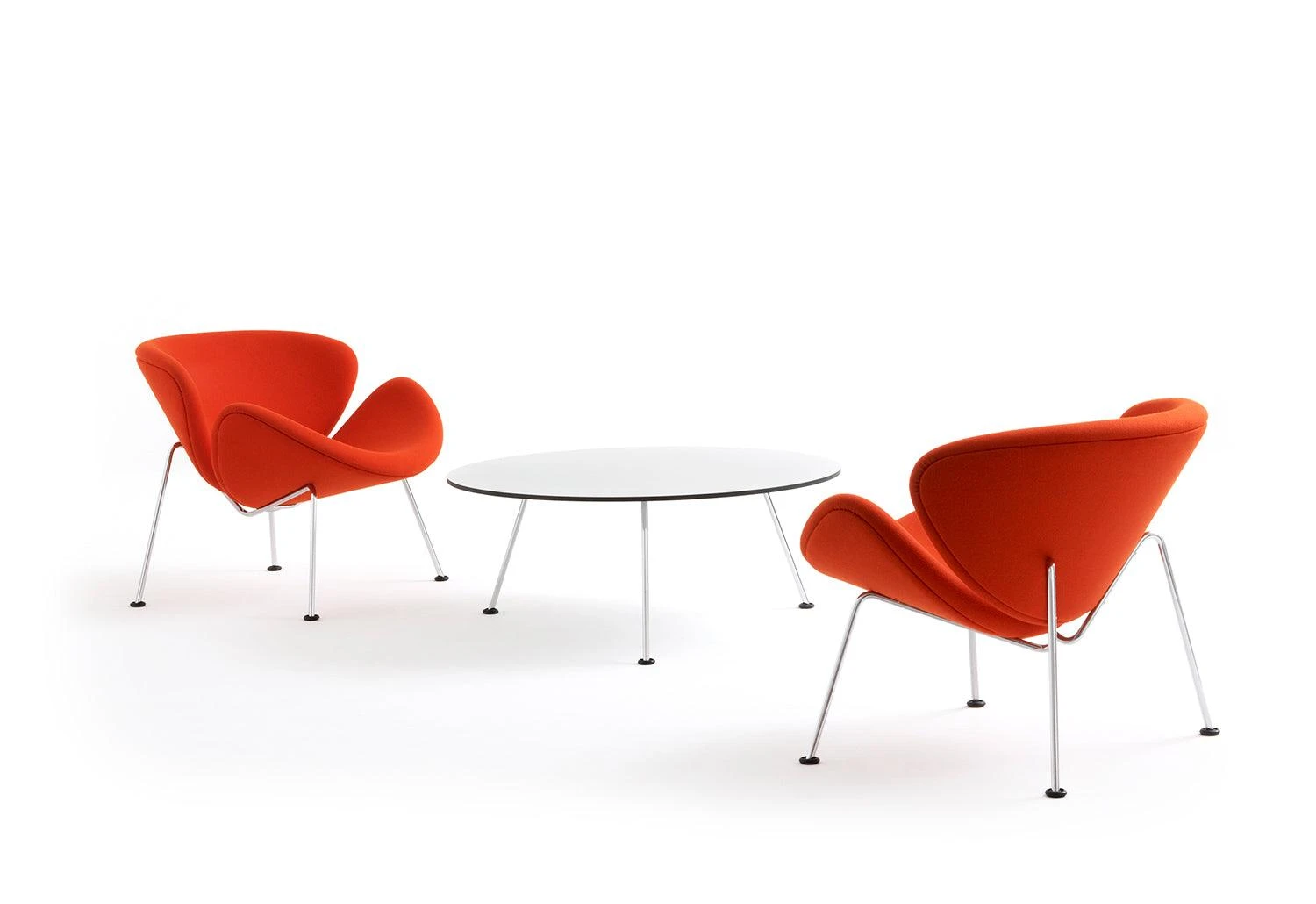 Designed by Pierre Paulin to accompany the Orange Slice chair, this table is simple and effective with feet identical to those of the Orange Slice chair. The perfect circular side table for modern living.