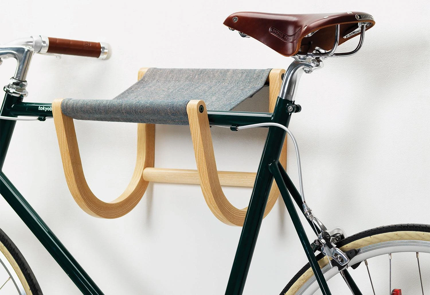 The René wall mounted bike rack is an indoor storage solution for your bicycle that is both stylish and practical. The solid ash frame is mountable to the wall, and the natural textile sling bears the weight of your bike whilst helping to keep it away from the wall.