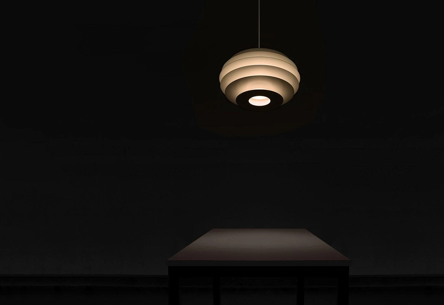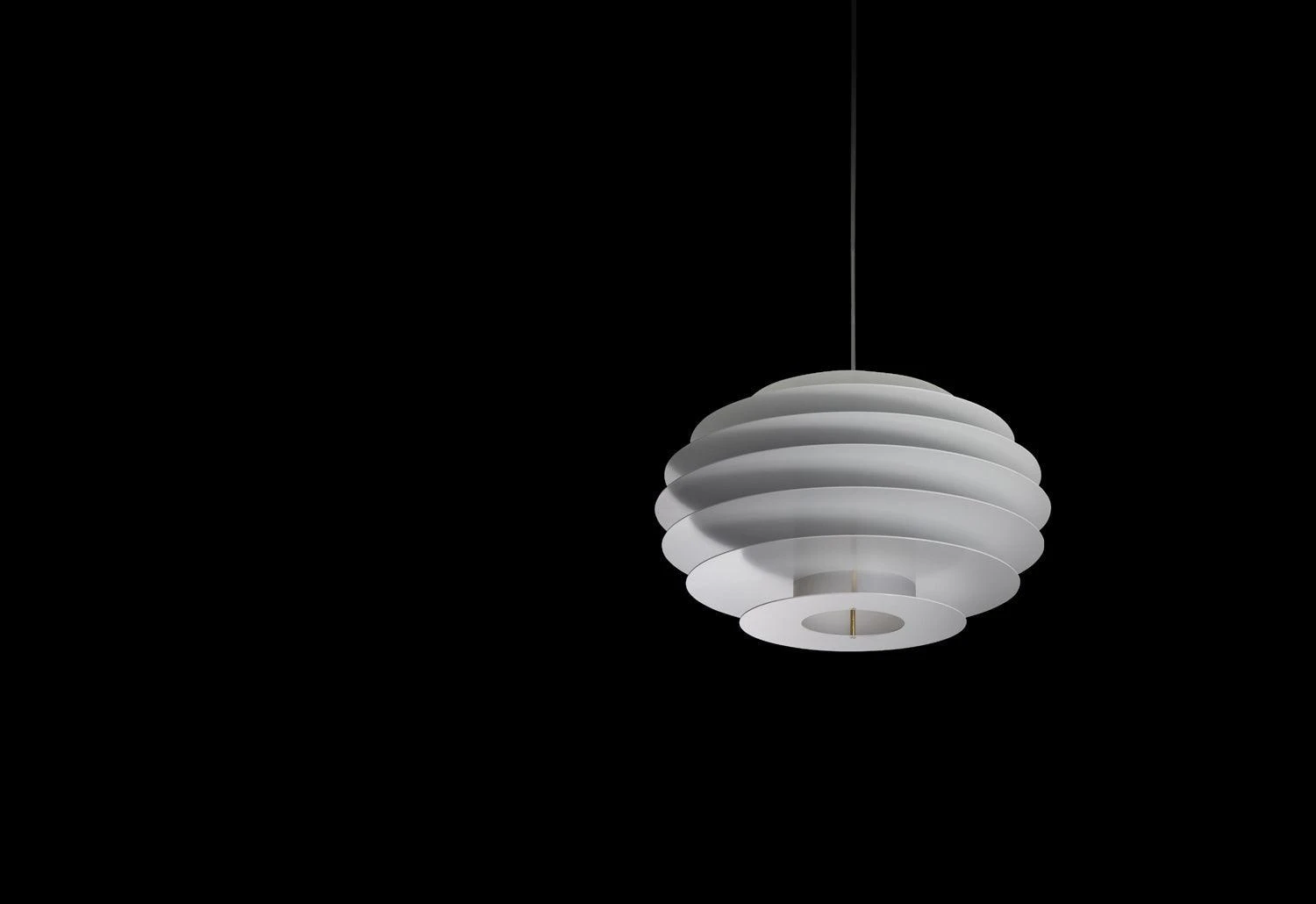 The Rota suspension light has a shade created by a series of ring-shaped discs that encircle the lighting element, held in place by precision-machined brass rods.