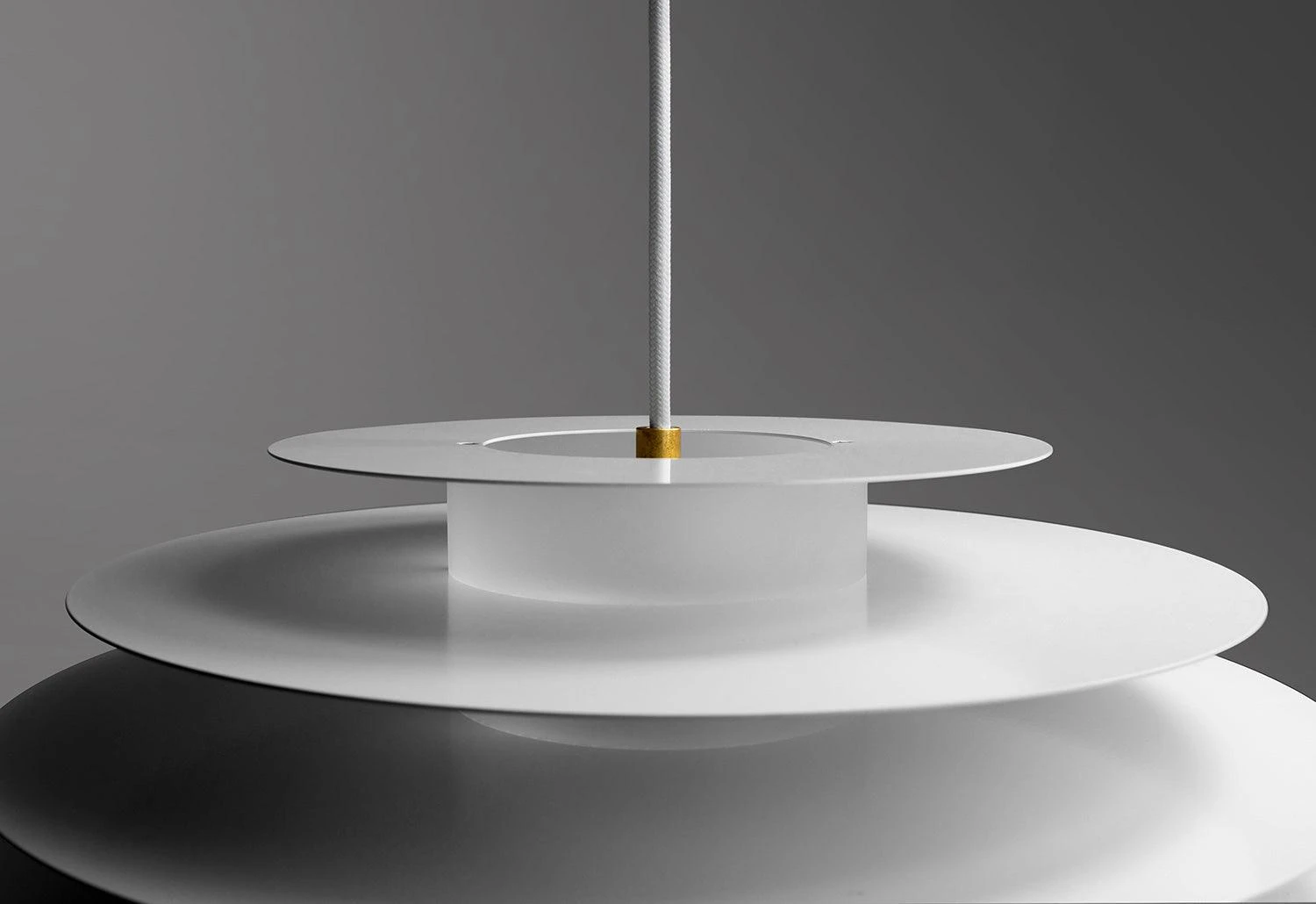 Suspended from a white textile cord with white and a brass ceiling rose, this light defines the Minimalux aesthetic: quietly modern and luxurious.