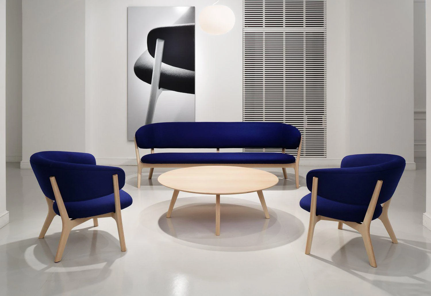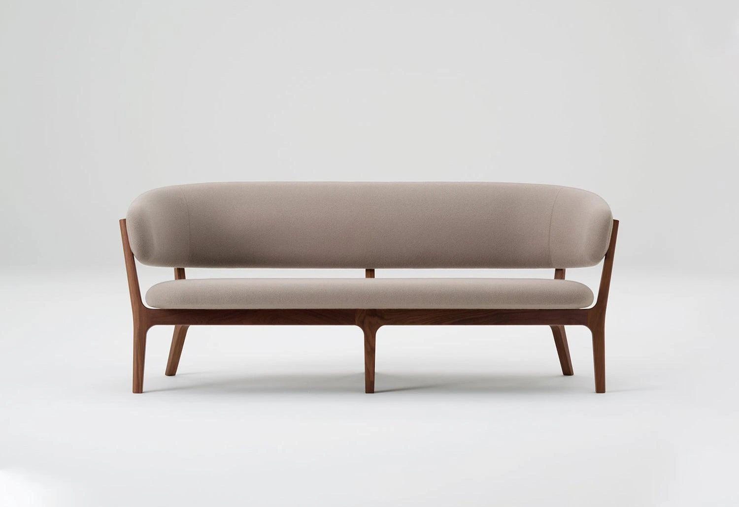 The Roundish sofa is available in beech, oak or walnut, with a variety of natural and coloured finishes.