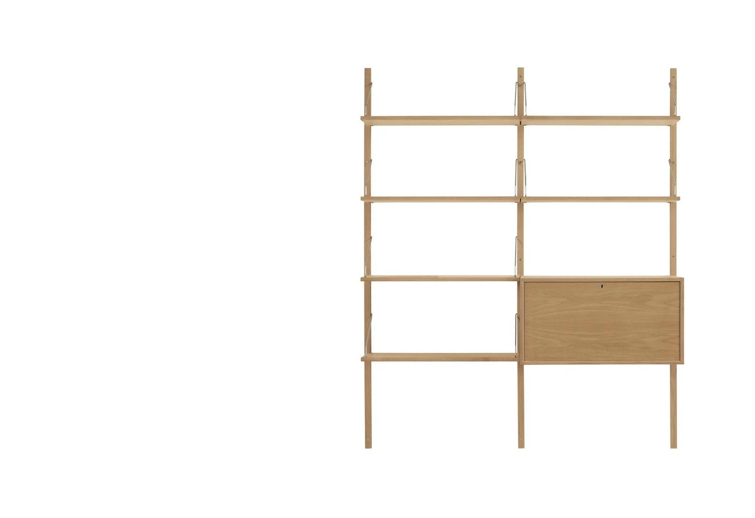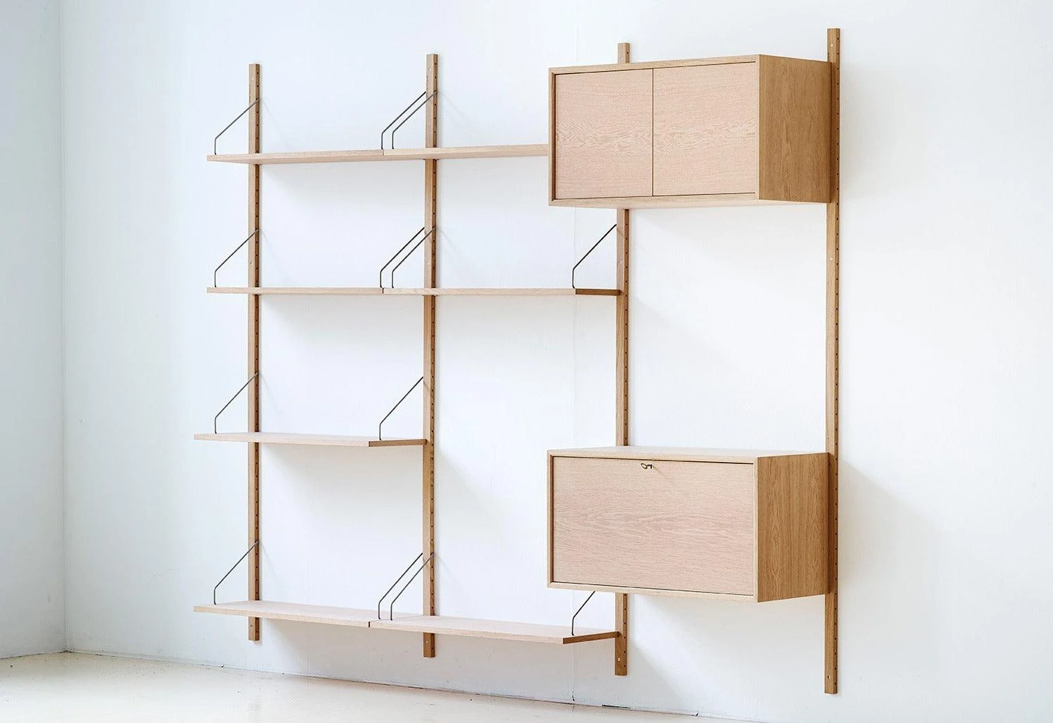 The Royal System was conceived by the Danish designer in 1948. Recognised with Gold Medal at Finland Furniture Fair in 1950 and silver at Milan Triennale, the system set a benchmark for wall storage design. In oak and walnut, the system is produced to exacting standards and offers great flexibility to extend or reconfigure.