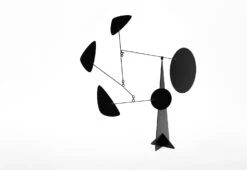 This mobile is a unique and minimalist monochrome mobile. It adds a sculptural element to any space. The compact size makes this mobile suitable for a desk or shelf and its beauty is enhanced by its subtle movement, enabled by precise forms and balance.