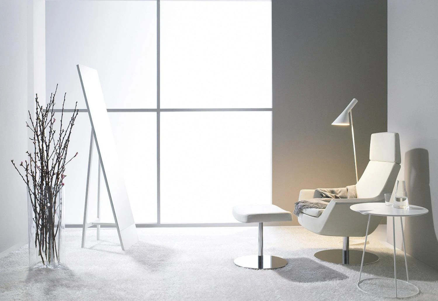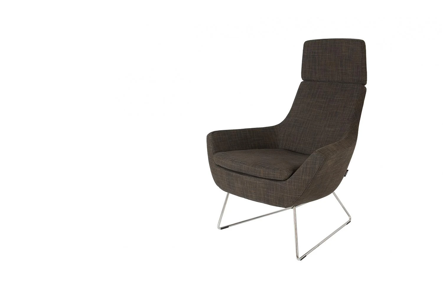 This modern easy chair is available with an angular steel sled base in white, black or chromed finish.