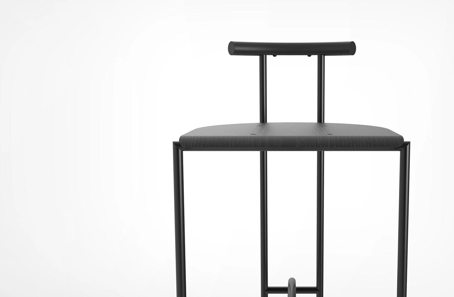 Built with slender, clean lines, the narrow stool offers an elegant frame, aesthetically enhanced with its rhythmic curves. It has been constructed from powder-coated tubular steel, with a moulded polyurethane backrest and plywood seat panel, making it a timeless addition to any home.