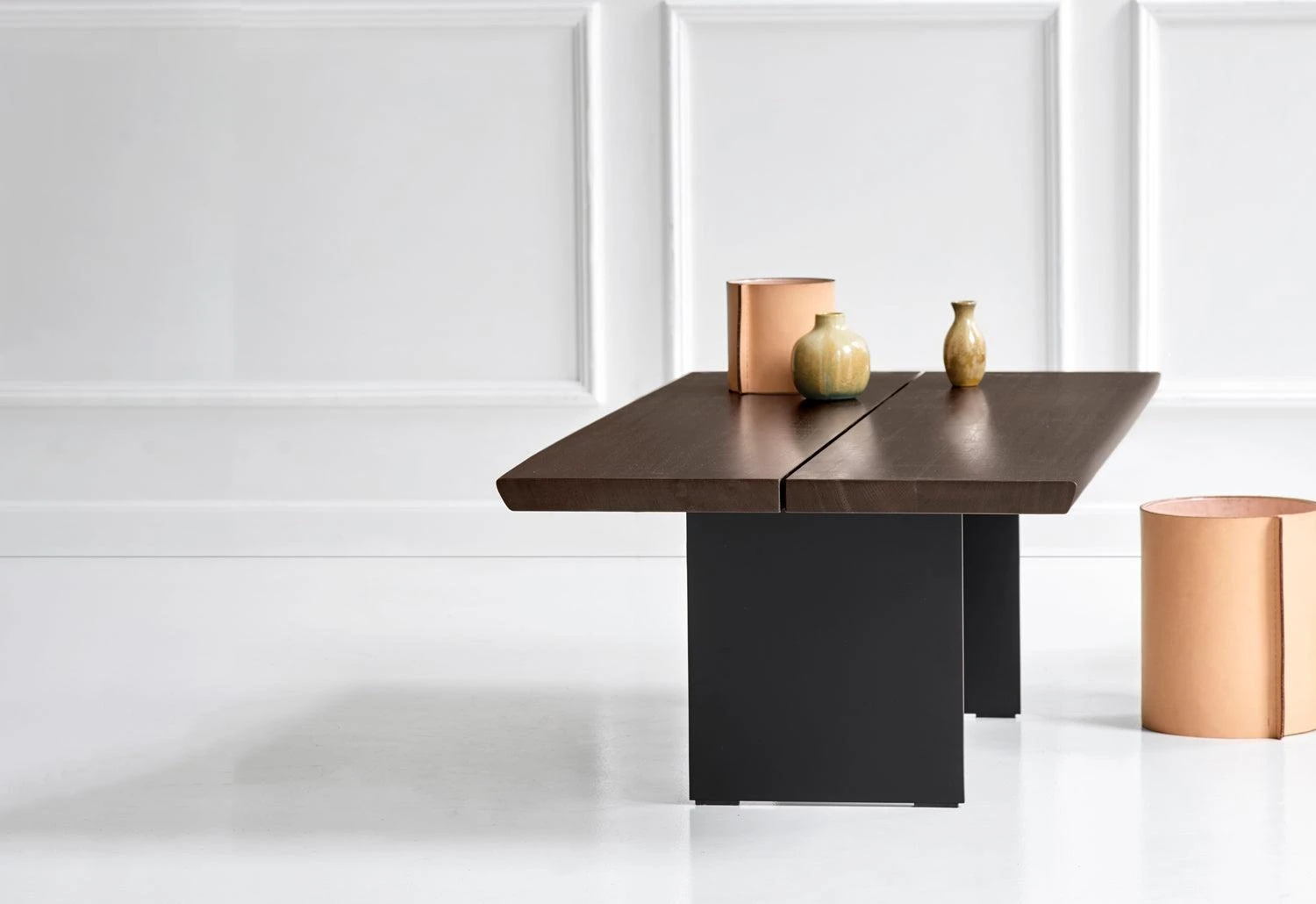 The Tree coffee table celebrates a natural material and the craft required to work it. The linear steel base supports a rectangular tabletop formed from two solid wooden planks which showcase the natural grain, cracking and knots of the tree from which they have been taken.