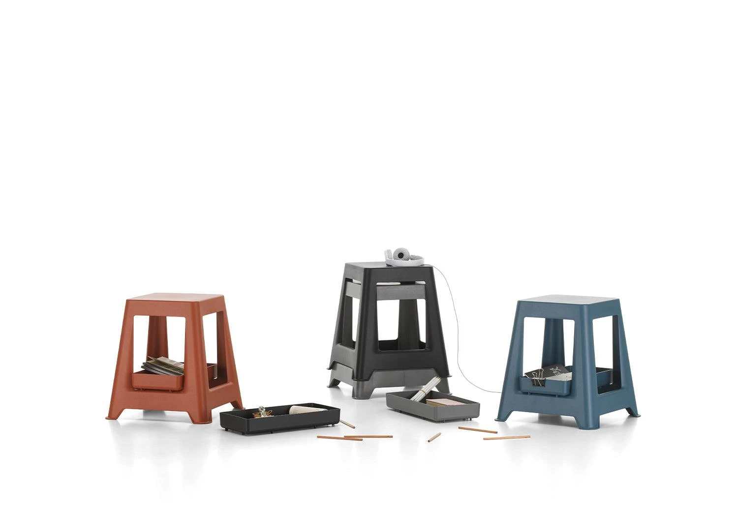 The optional high-lipped Chap tray can be supported on the stable leg construction. Store your phone, cables, stationery items easily inside the tray. Chap and Chap Tray are manufactured from recycled plastics and are 100% recyclable themselves. Both products are available in a selection of colours.
