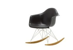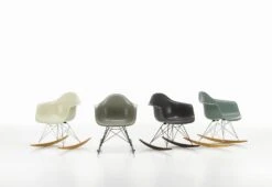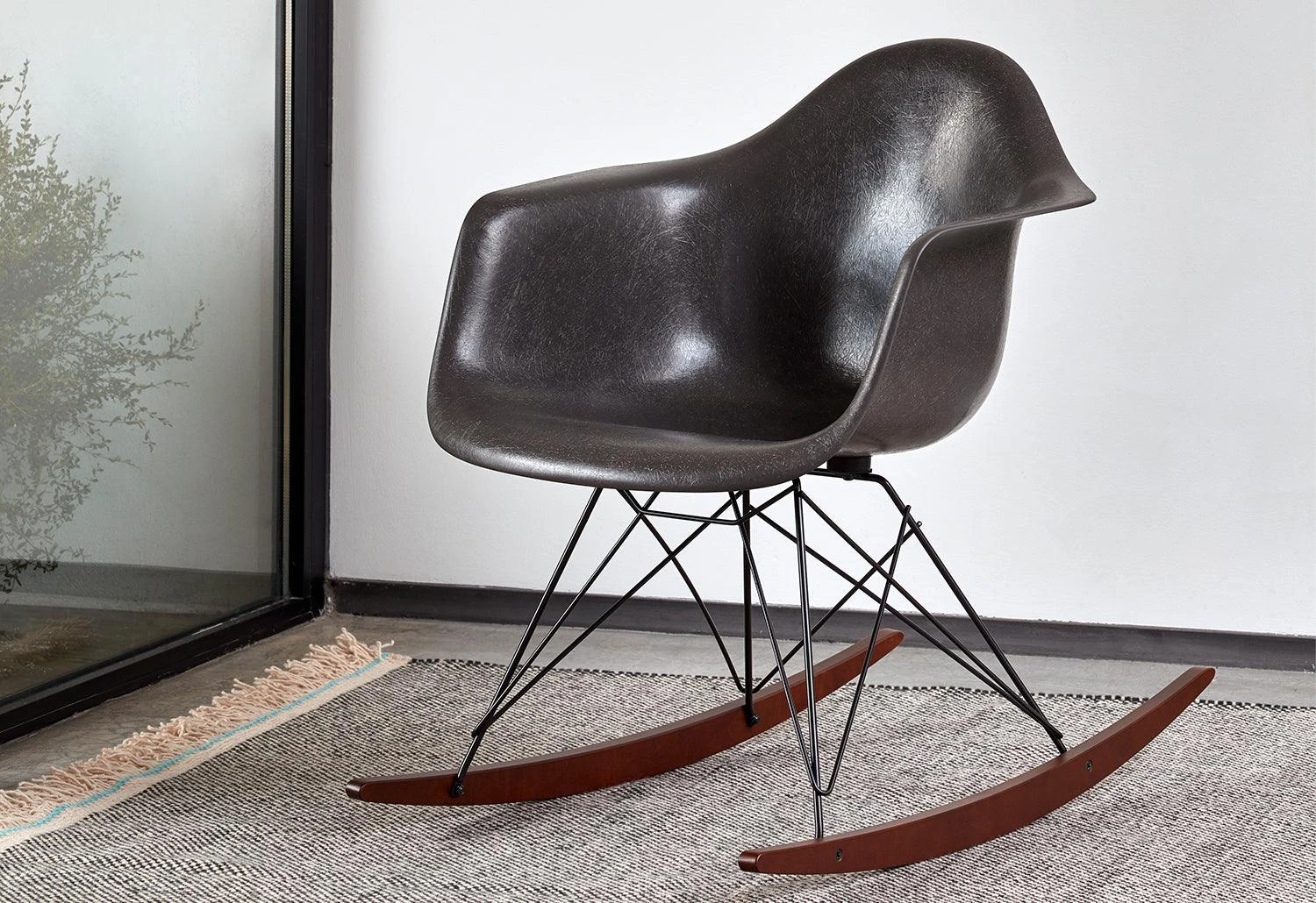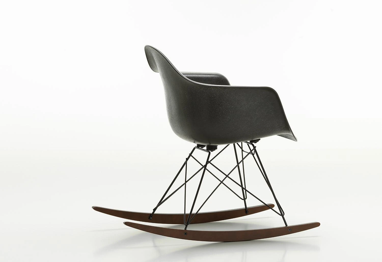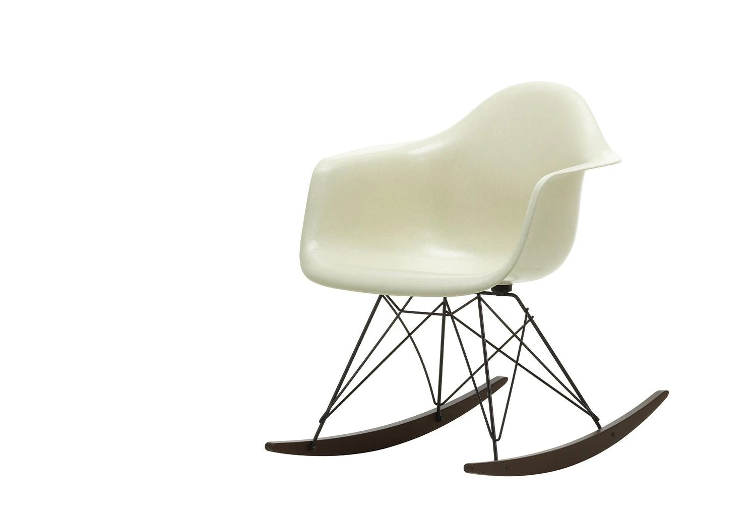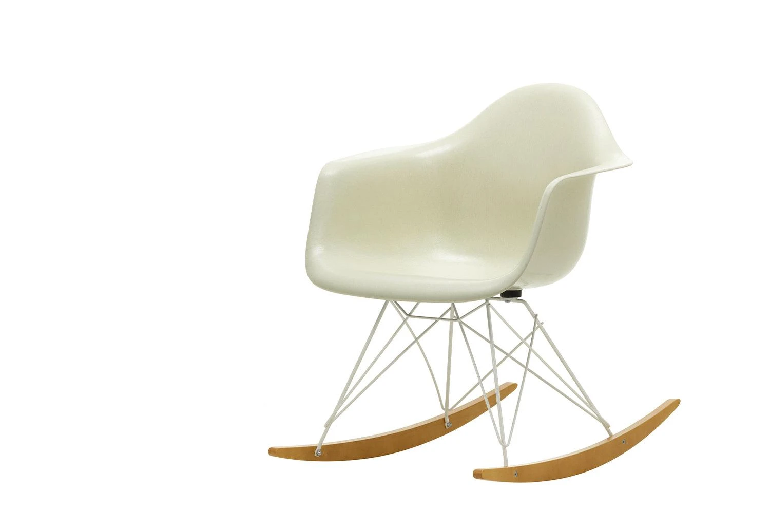 This led to them using glass-fibre reinforced polyester resin, which until then had been primarily restricted to military applications such as aircraft radomes and cockpit covers. The RAR armchair features dyed-through, glass-fibre reinforced polyester (fibreglass) similar to the earliest models. The base features a wire base with cross struts with solid maple runners available in a dark-maple or golden-maple finish.