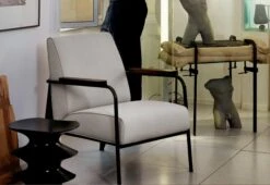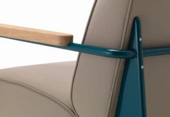 The perfect embodiment of Jean Prouvé’s structural design aesthetic, the Fauteuil de Salon chair has a distinct yet understated silhouette. Characterised by its tabular sloped legs, wooden armrests and plump seating, the armchair has an inviting presence and is perfect for lounging.