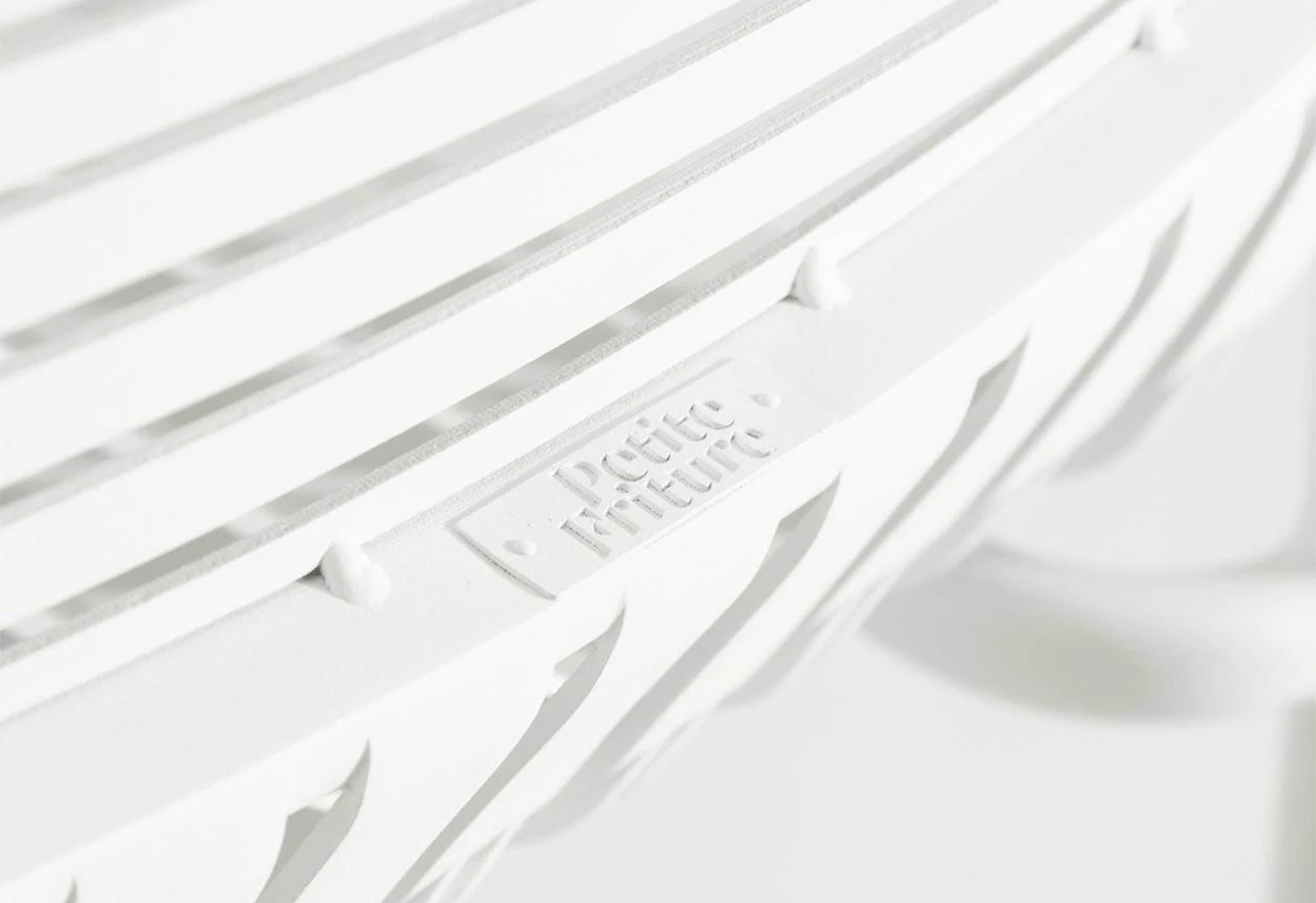 Vertical and horizontal slatted metal seats and backrests combine with an oval-shaped frame element to create a strong graphic presence, lending a distinctive identity to this strongly contemporary collection.
