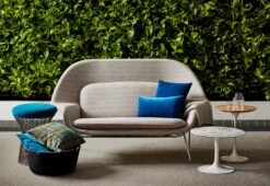 The Womb Sofa is a double-wide version of the iconic Womb chair, acclaimed as one of the most comfortable modern chairs produced. The Womb Sofa was developed for Saarinen’s first big architectural commission: The General Motors Technical Center in Warren, Michigan – a twenty-five-building complex that required furnishings for over 5,000 people.