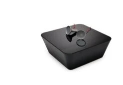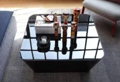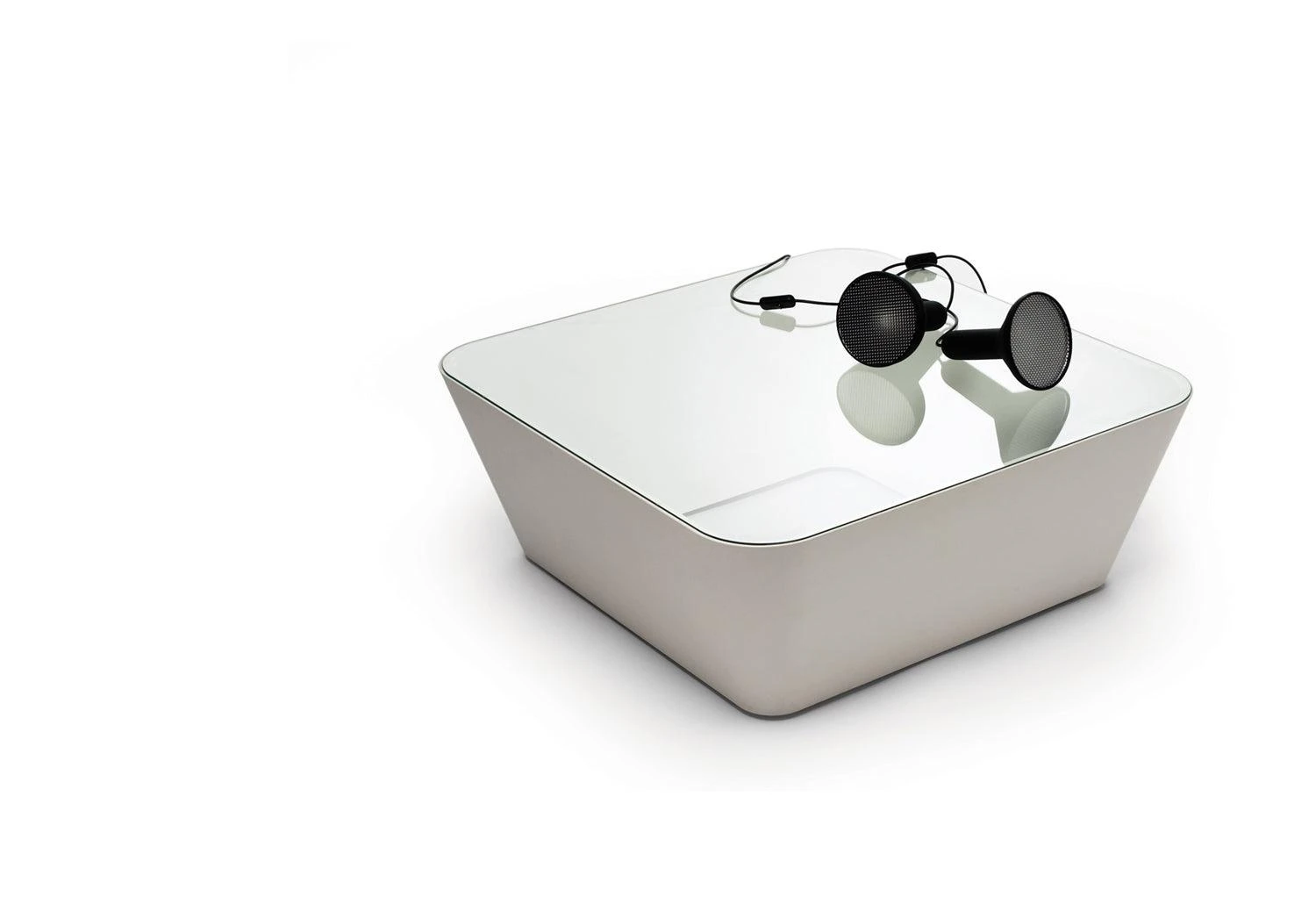 The table appears to hover slightly above the ground. A glass top is barely visible, giving the impression that objects placed upon it are unsupported. A dual wall construction provides another visual illusion, looking into the table its sides seem to converge at a greater pitch than expected.